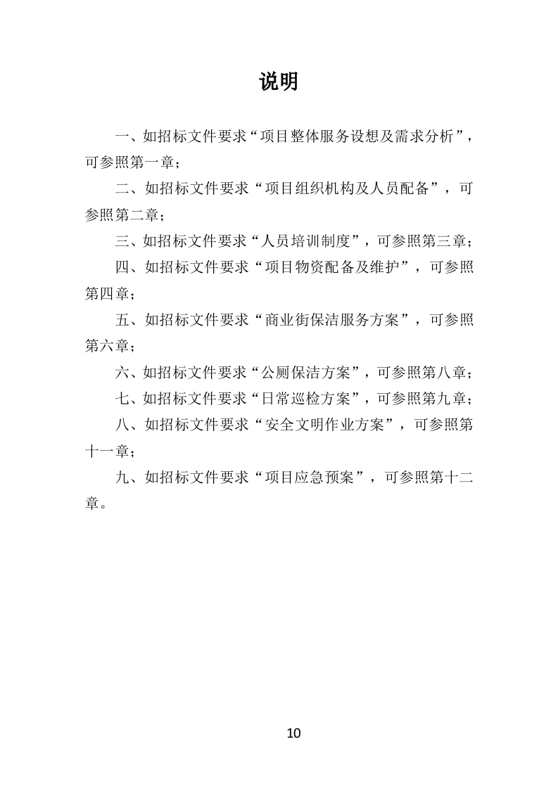 商业街保洁服务投标方案目录第一章项目整体设想及需求分析…10第一节项目背景分析.12一、商业街的定义、特点及分类.12二、保洁行业概述….15三、保洁服务行业存在的问题分析…17四、保洁行业市场前景分析.20五、保洁服务行业政策环境分析.…22六、保洁服务行业发展趋势…23第二节整体服务设想及策划27一、工作计划…27二、项目总体设想.。27三、项目管理的创新28四、项目重难点分析35第三节项目需求分析.37一、月服务理念…37二、服务宗旨37三、服务内容38四、服务要求39第二章项目组织机构及人员配备…49第一节项目组织机构49一、项目组织机构建立步骤…49二、公司组织机构设置的原则.501