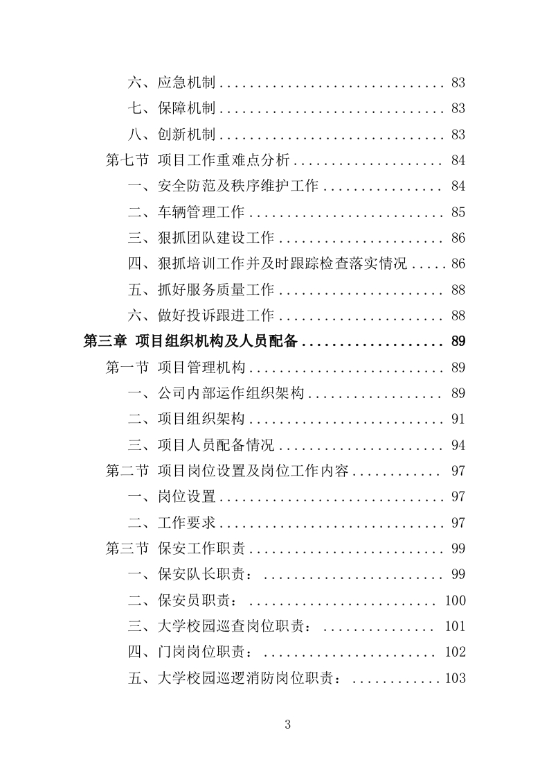 大学保安服务投标方案目录第一章项目背景及需求分析....16第一节项目背景..16一、保安服务行业定义与分类.16二、我国保安行业的历史发展.18三、我国保安行业的基本特征...19四、大学校园保安行业市场分析...21五、大学校园保安行业现状及要求.·23第二节项目需求分析.·....27一、项目概况..27二、服务要求..27第二章项目整体服务设想及策划..·32第一节项目管理服务理念..32一、服务理念..32二、管理定位。。。。。33三、管理目标.34四、保障措施。。。。。37五、服务计划.39六、服务措施...40七、管理方法...」48第二节项目管理服务承诺..··52一、项目承诺要领....52二、纪律承诺及措施.·.571