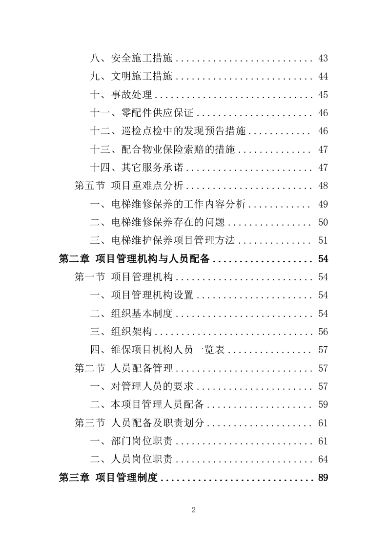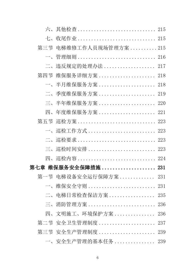 电梯维保服务投标方案目录第一章项目整体服务设想...11第一节行业现状及发展趋势.··11一、电梯行业..·11二、电梯维保行业..15第二节项目概述.·20一、项目基本情况..20二、维保服务总体要求.·20三、服务期限及维保方式..20四、维保流程规范..·..·21五、电梯各部件保养要求..·21六、电梯维保服务内容.··。。。25第三节维保服务总体思路.·.26一、总体要求...26二、重点任务..27第四节维保服务整体设想与策划.··29一、人员配备、时间安排...30二、24小时故障处理...30三、巡检点检.·31四、维护保养.31五、运行保障..42六、年季质量检查.42七、文明、安全作业..42