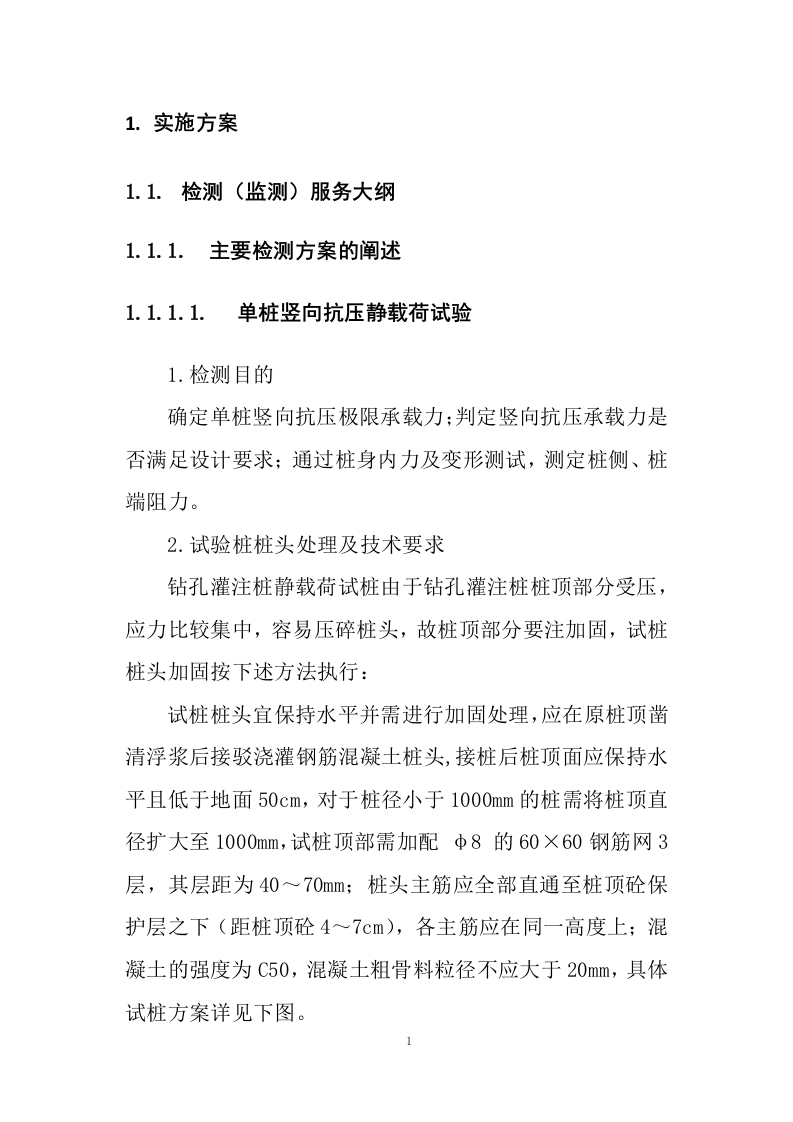桩基检测投标方案目录1.实施方案……1.1.检测(监测)服务大纲........11.1.1.主要检测方案的阐述........11.1.2.资料整理与成果分析...·.1.1.3.资料整理分析与报告编写..71.2.服务重点内容阐述....91.2.1.基桩低应变动力检测.....91.2.2.超声波检测...141.3.服务工作程序...151.4.装备技术及精度....222.服务质量保证...232.1.质量管理体系..·.232.2.质量管理班子....242.2.1.质量管理组织机构........242.2.2.质量管理班子成员的经验或履历...242.3.质量管理活动.........252.3.1.质量承诺..252.3.2.质量管理计划.....252.4.质量管理制度.·..26