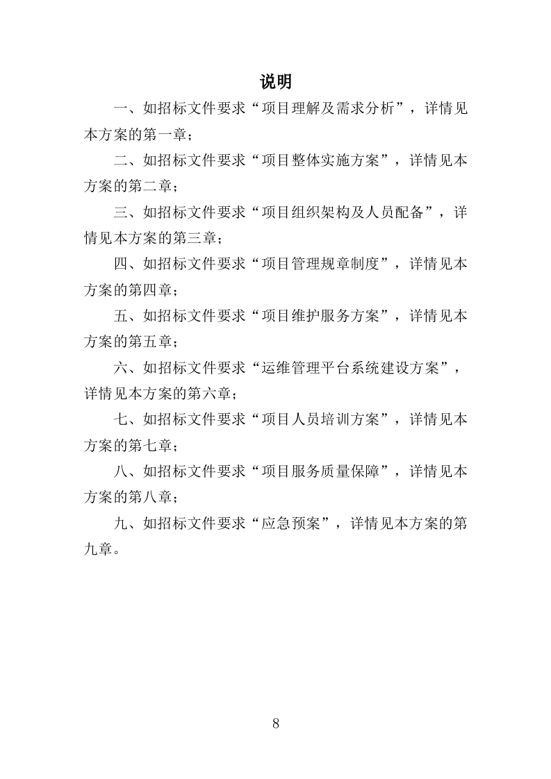 服务器及软件维护服务投标方案目录第一章项目理解及需求分析..。10第一节项目理解...10一、服务器基础知识...·10二、服务器的集群技术...31三、服务器集群后的系统特性..·33第二节项目需求分析..38一、项目概述...38二、服务内容....38第三节服务器维护与保养要点...·57一、注重机房环境的建设..··57二、做好硬件维护工作..·58三、维护好服务器软件..58四、做好电力控制..59五、密码管理...59第二章项目整体实施方案...61第一节项目整体维护服务设想61一、提供专业维护服务..·.61二、建立设备配置管理.·61三、加强问题事件管理..·62四、完善服务管理体系...62五、做好应急预案..62第二节运维流程及服务方式...·631