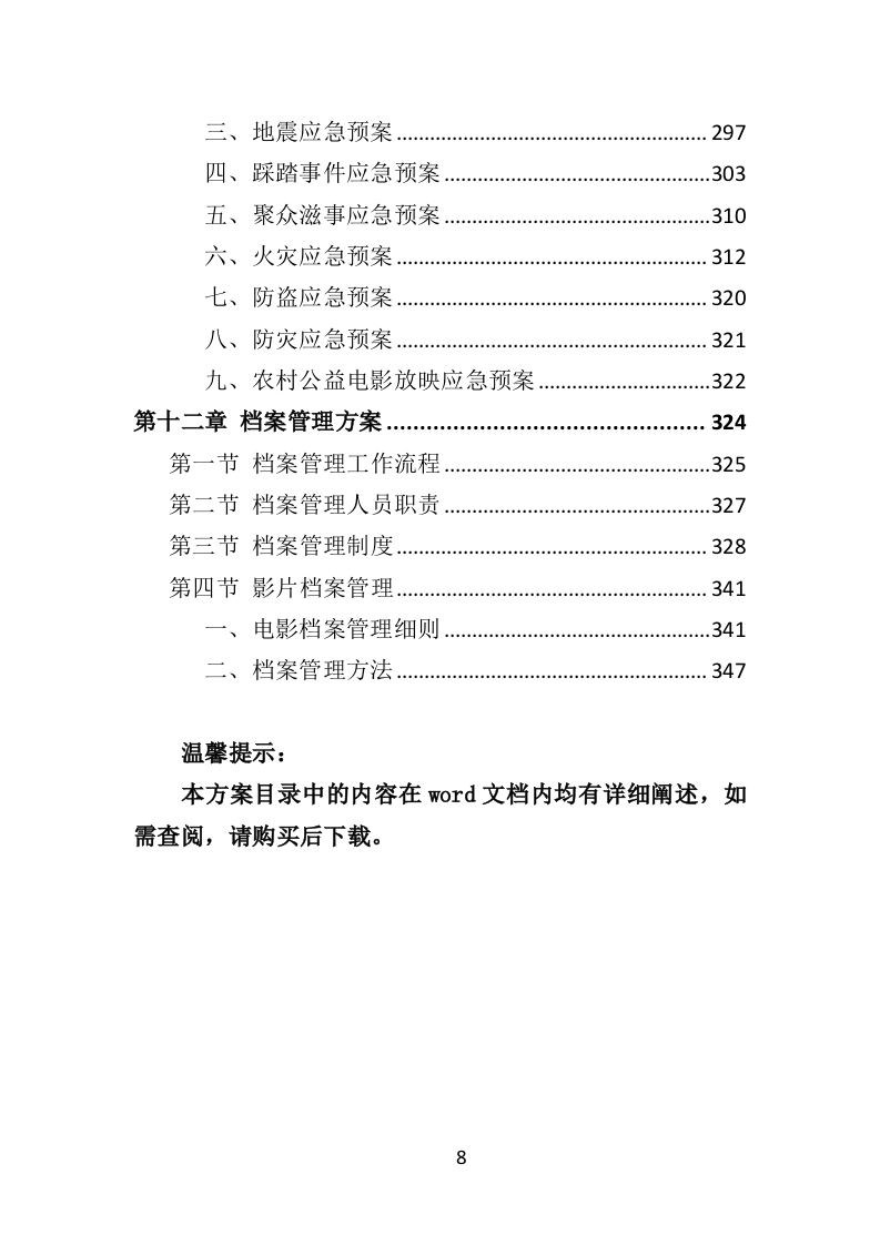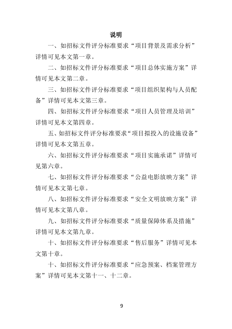 公益电影放映服务投标方案349页adminxiao2个月前发布关注私信1.51MB349页32公益电影放映服务投标方案349页此内容为付费资源,请付费后查看R88黄金会员免费钻石会员免费立即购买您当前未登录!建议登陆后购买,可保存购买订单付费资源 第1页 / 共349页 第2页 / 共349页 第3页 / 共349页 第4页 / 共349页 第5页 / 共349页 第6页 / 共349页 第7页 / 共349页 第8页 / 共349页 第9页 / 共349页 第10页 / 共349页 试读已结束,还剩339页,您可下载完整版后进行离线阅读 © 版权声明本站所有资源均来源于网络。THE END27社会服务 文本预览 公益电影放映服务投标方案目录第一章项目背景及需求分析.…11第一节项目背景..11一、农村公益电影放映现状12二、农村公益电影放映存在问题及对策.13三、合理化建议.18第二节需求分析.22一、项目概况..22二、服务要求.23第二章项目总体实施方案..29第一节项目整体服务设想.29一、指导思想.29二、工作目标29三、服务工作管理思路.29四、放映安排….33五、工作保障.33第二节实施方案..34一、实施方案.34二、放映要求.35三、保障措施…..37四、实施承诺….38第三章项目组织机构及人员配备.39第一节项目组织机构..391 查看更多 收起部分 喜欢就支持一下吧 分享QQ空间微博QQ好友海报分享复制链接收藏