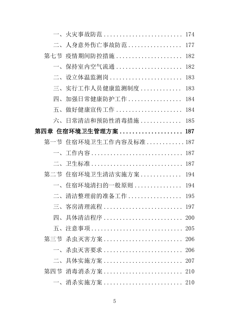 住宿服务投标方案目录第一章整体实施方案..8第一节管理目标..8一、总体目标...8二、安全管理目标..·8三、卫生管理目标9第二节管理具体措施..10一、安全管理措施10二、卫生管理措施16三、人员管理措施..17第三节服务特色...20一、贵宾快速入住.。20二、亲情化服务21三、客人生日送祝福21四、病客服务..·22五、无烟客房22六、酒店个性化管家服务23第四节项目重难点分析及解决方案..24一、安全管理重难点分析及解决方案..·.....24二、卫生管理重难点分析及解决方案...26三、人员管理重难点及解决措施...29第五节住宿地点与甲方的距离....36第六节对本项目采购需求的响应.......36
