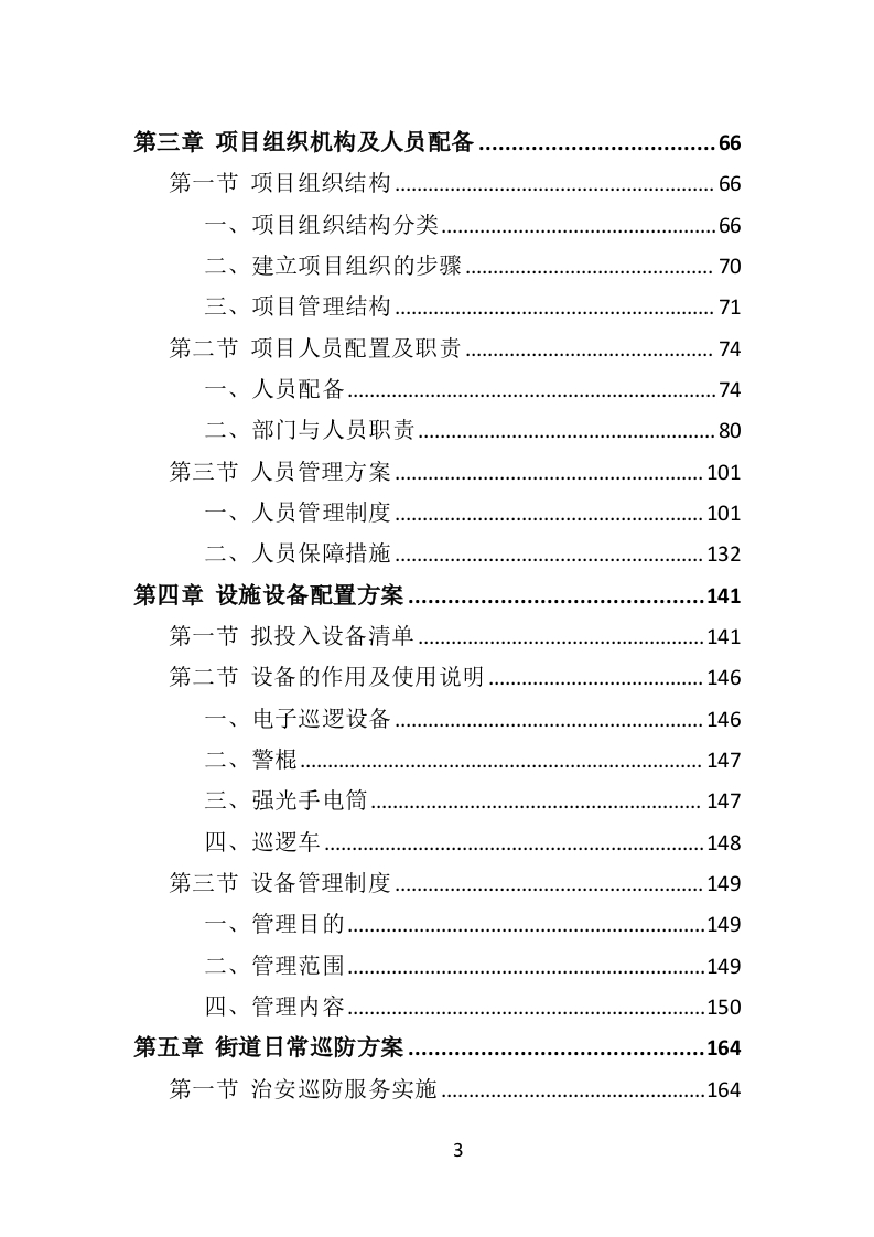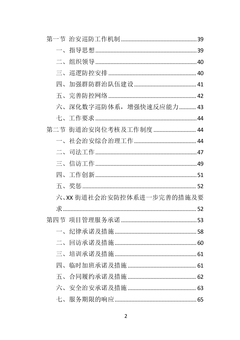 街道治安巡服务投标方案目录第一章项目概况及需求分析.….15第一节街道社区治安管理的现状及对策15一、治安相关概念15二、治安管理的内容18三、我国社区治安管理存在的问题20四、社区治安管理问题的原因分析24五、认清社区治安防范的重要意义26六、强化载体作用,促进防范设施的完善27七、开发和运用丰富的防范技术手段28八、运用市场机制加强城市社区治安防范.29第二节社区治安管理特征及和内容..30一、社区治安管理的特征30二、社区治安管理的基本原则.30三、社区治安管理的基本内容..31四、新形势下完善社区治安管理的具体措施33第三节社区治安管理的功能及途径。.34一、社区治安管理的功能…34二、完善社区治安管理的途径.34第四节项目需求分析…35一、项目概况.….35二、服务内容及要求.36第二章项目整体设想及策划..391