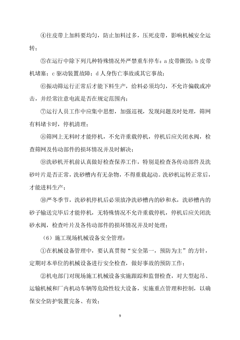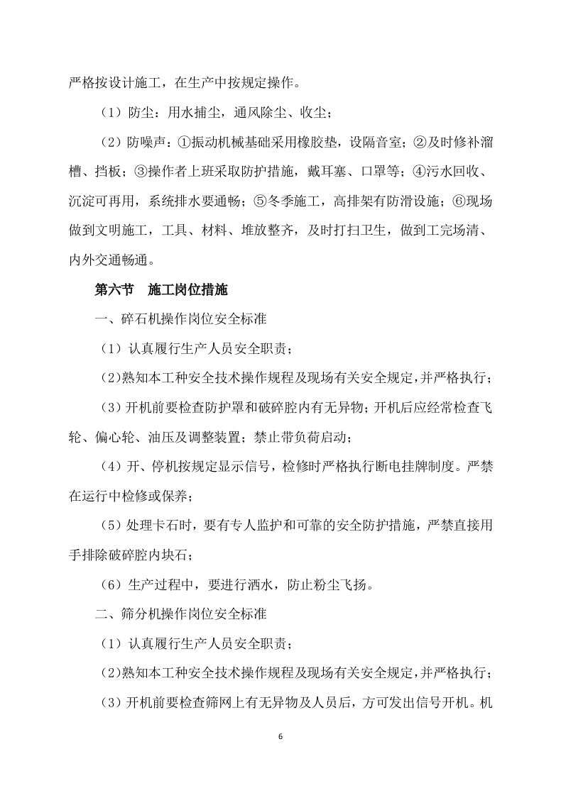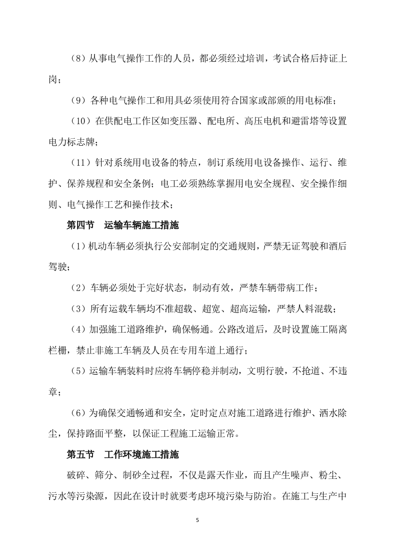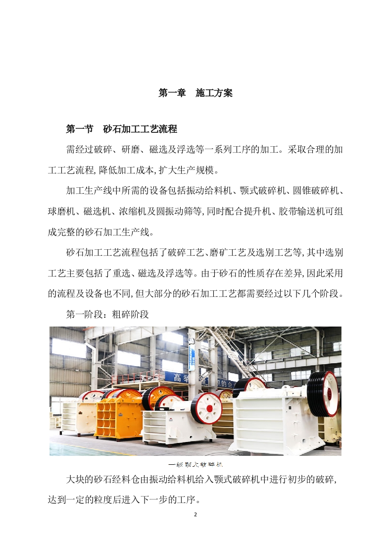 砂石料厂生产运输投标方案目录第一章施工方案..第一节砂石加工工艺流程...2第二节供电与电气设备施工检查措施.3第三节施工用电措施.…4第四节运输车辆施工措施....5第五节工作环境施工措施.....5第六节施工岗位措施..…….6第二章施工进度计划.…..10第三章资源投入计划。.21第一节投入施工的主要机械设备、材料和劳动力配置计划.....21第二节管理技术人员、专业技术人员的配置.....47第三节关键工期针对性的组织设计..…..54第四节工程质量保证措施.................60第五章安全作业保证措施...77第六章文明施工、环境保护主要措施、作业区域恢复治理方案....123、1