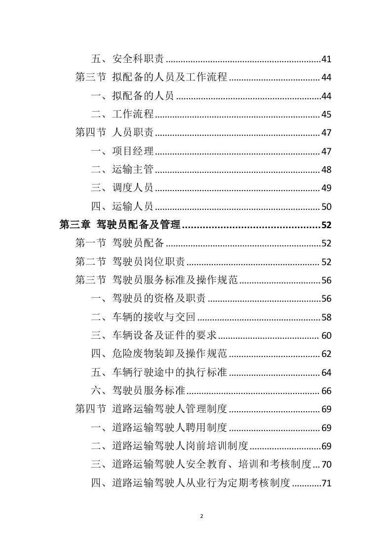危险废物运输投标方案目录第一章项目背景与需求分析....16第一节危险废物运输现状分析16一、危险废物运输管理现状...16二、我国危险废物运输管理存在的问题.17三、我国危险废物运输的发展与对策20第二节项目需求分析……22一、项目概况...22二、服务需求及标准.23三、车辆及人员要求….24四、工作人员要求.26五、考核办法/验收方式…27六、付款条件.27第三节危险废物运输重难点及应对措施…27一、危险废物运输行业的重难点.27二、针对危险废物运输重难点的措施.….29第二章公司组织架构及职责....31第一节公司组织架构.31第二节各部门岗位职责.31一、办公室职责…31二、财务科职责.34三、行政科职责...37四、车队岗位职责…..40