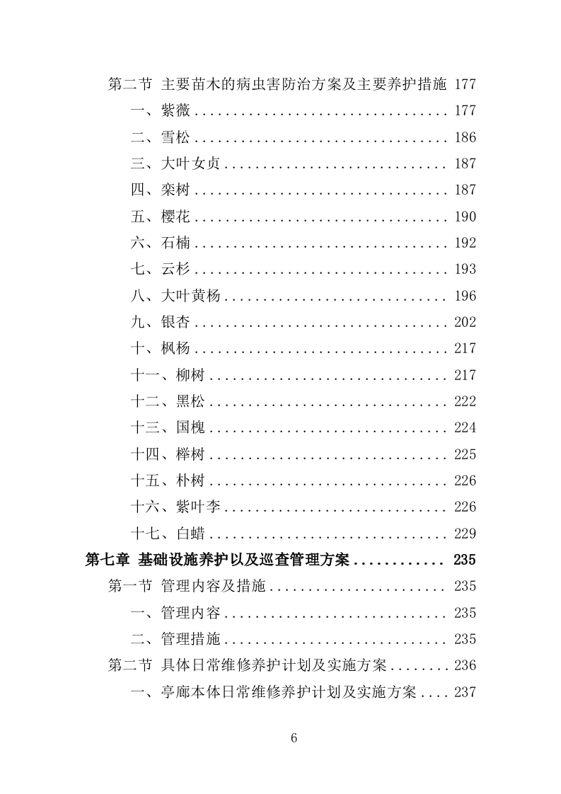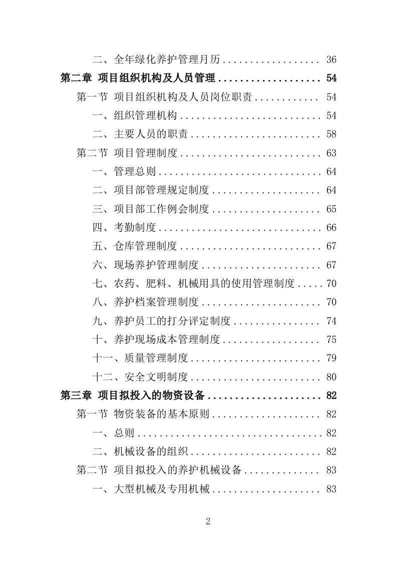 公园绿化养护服务投标方案目录第一章服务整体设想及策划.·12第一节项目概况.....。13一、养护概况...13二、养护标准及质量标准14三、绿化养护工作....19四、养护技术要求...25第二节绿化养护重难点及解决措施.·29一、范围广..29二、灌溉取水30三、行道树较多30四、修剪防寒..31五、设施维护保养...31六、苗木种类多,预防病虫害32七、修剪及补栽.·33第三节工作目标..·33一、质量目标..33二、工期目标...33三、安全施工目标..34四、文明施工目标..34五、服务目标..34第四节服务计划..34一、全年养护计划....34