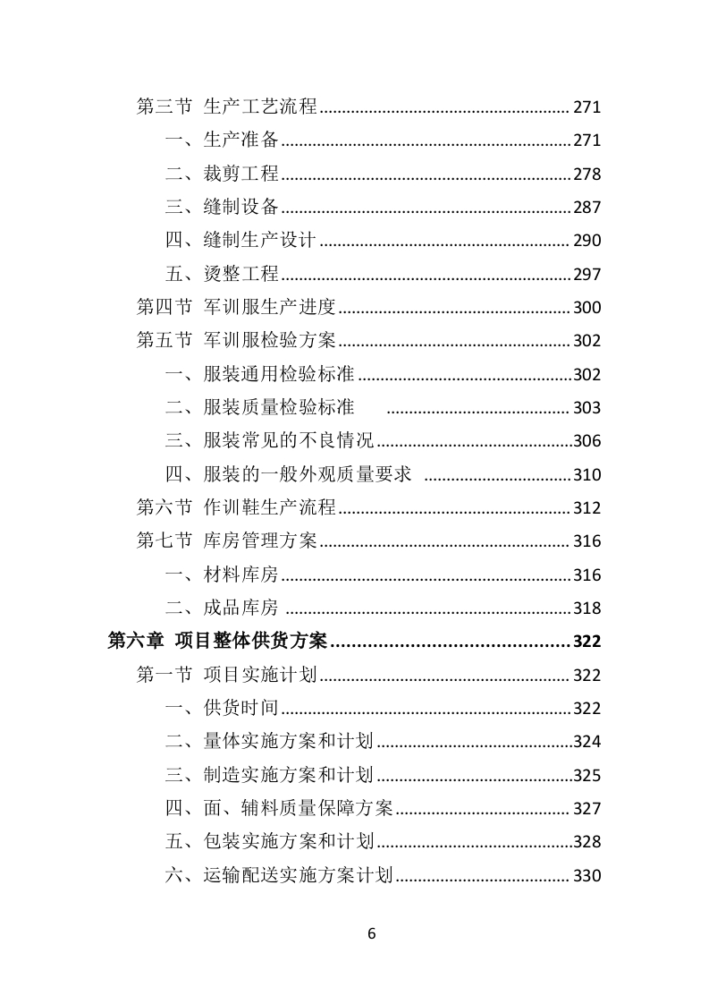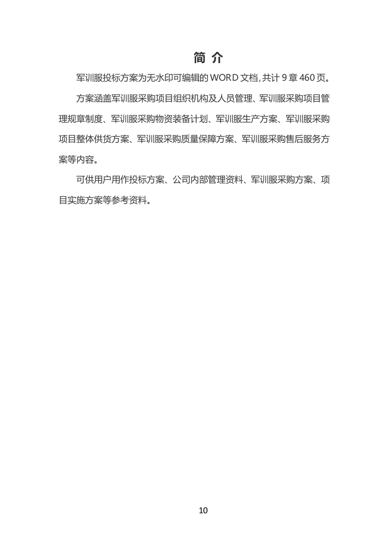 军训服投标方案目录第一章项目整体服务设想.….10第一节项目整体服务流程.11一、产品供应实施计划.11二、组织生产供应方案..14三、配送运输方案..15四、产品的验收.16第二节采购需求….17第二章项目组织机构及人员管理.28第一节项目组织机构.…28一、公司行政组织机构设置.…28二、拟投入的人员.29第二节岗位职责.29一、部门职责.29二、管理人员岗位职责.36三、员工岗位职责.…47第三节公司管理原则.71一、员工管理原则.71二、服装生产管理原则….72第四节员工考核方案....76一、财务部员工绩效考核评分标准.76二、产品开发部员工绩效考核评分标准.80三、品管部员工绩效考核评分标准.…871