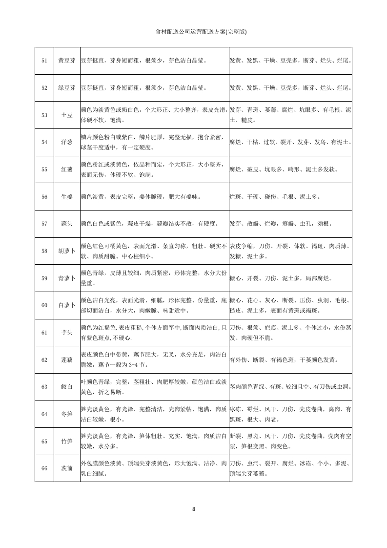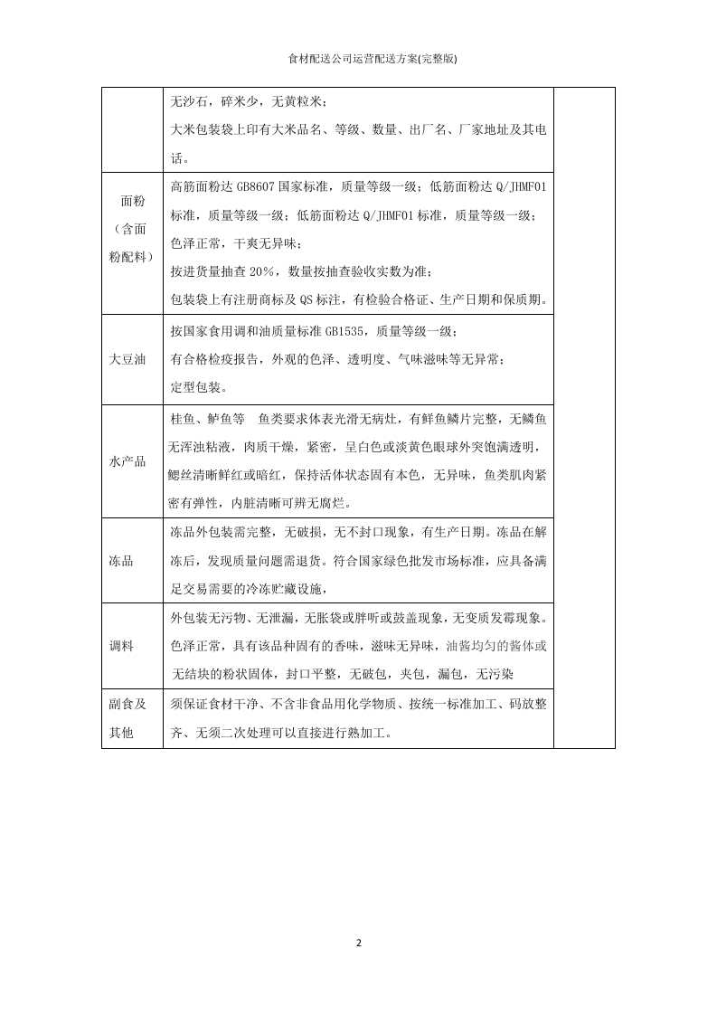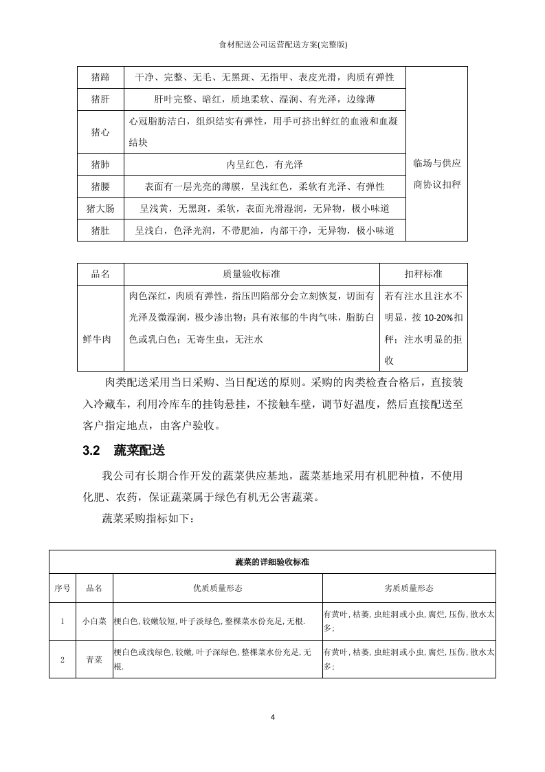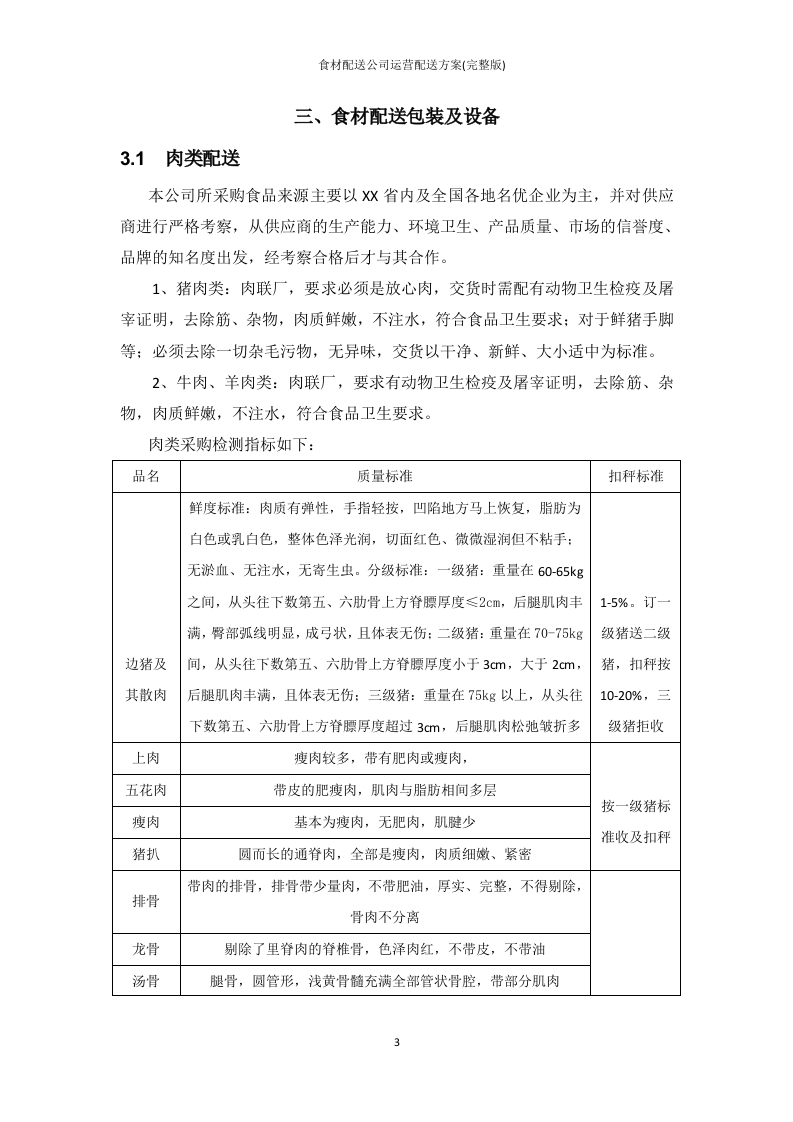 食材配送公司运营配送方案(完整版)食材配送公司运营配送方案供应产品规格标准项目技术、规格、质量要求及包装标准备注猪肉:净瘦肉、后腿肉、猪肝、排骨、猪油、筒子骨、猪血等:须保证供应为屠宰厂当日屠宰的猪肉,肉身须盖有卫生检疫章,须出具加盖国家或地方政府监督所检疫章动物检疫证明。肉品须表皮洁净、膘厚适中、色泽鲜亮、纹理清晰、肉质细腻、无异味、去骨、无毛、按肉类压无水迹牛肉:肉身须盖有卫生检疫章,须出具加盖国家或地方政府监督所检疫章的动物检疫证明,肉品须色泽鲜亮、无任何异味、按压无水迹。纹理清晰,肉质细腻,品质好当季各类新鲜蔬菜以及大棚种植蔬菜,蔬菜类必须保证无黄叶、枯死叶、无虫、无杂质,须48小时内采摘供应,原菜须保证菜面干净、所有商蔬菜类无明显泥土、码放整齐、无破损、大小基本统一、不得过熟或欠熟:品必须净菜须保证菜面完全干净、无泥土、按统一标准加工、码放整齐、无满足国须二次处理可以直接进行熟加工家和地鲜新、大小均匀、无破损、色泽光滑,须出具加盖地方政府监督所检鸡蛋方相关疫章的动物检疫证明规定豆腐、豆腐干、绿豆芽、黄豆芽、红豆等:须保证食材干净、不含非豆制品食品用化学物质、按统一标准加工、码放整齐、无须二次处理可以直接进行熟加工当即各类水果,无虫、无杂质,须48小时内采摘供应,原水果须保水果证果面干净、无明显泥土、码放整齐、无破损、大小基本统一、不得过熟或欠熟米线、鲜面条、干面条、饵丝:要求原材料不含非食品用化学物质、米线面不掺假、不过期、不变质、不变味、无杂质、无毒害,符合国家食品条行业的标准大米大米须达国家1354一86特二级标准,水分含量在12°以下,无掺杂、1