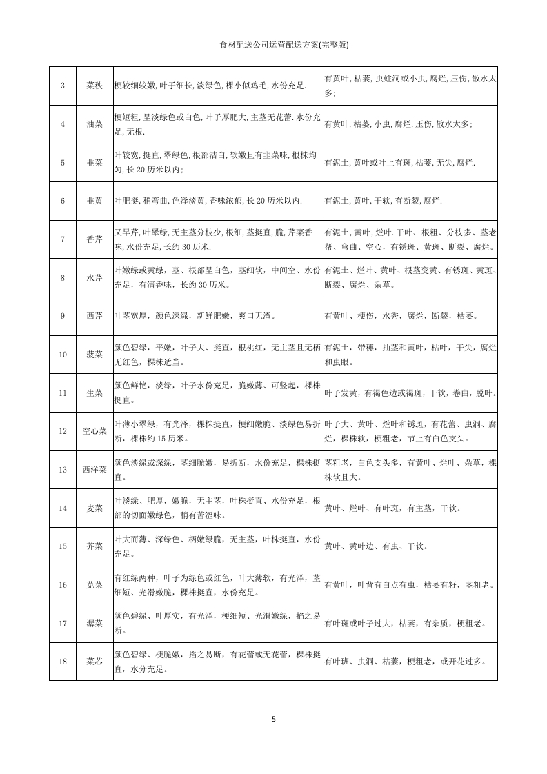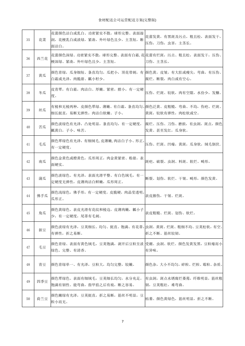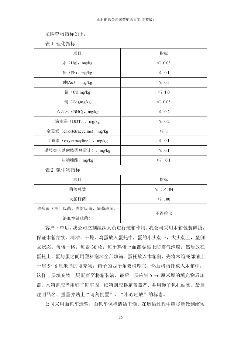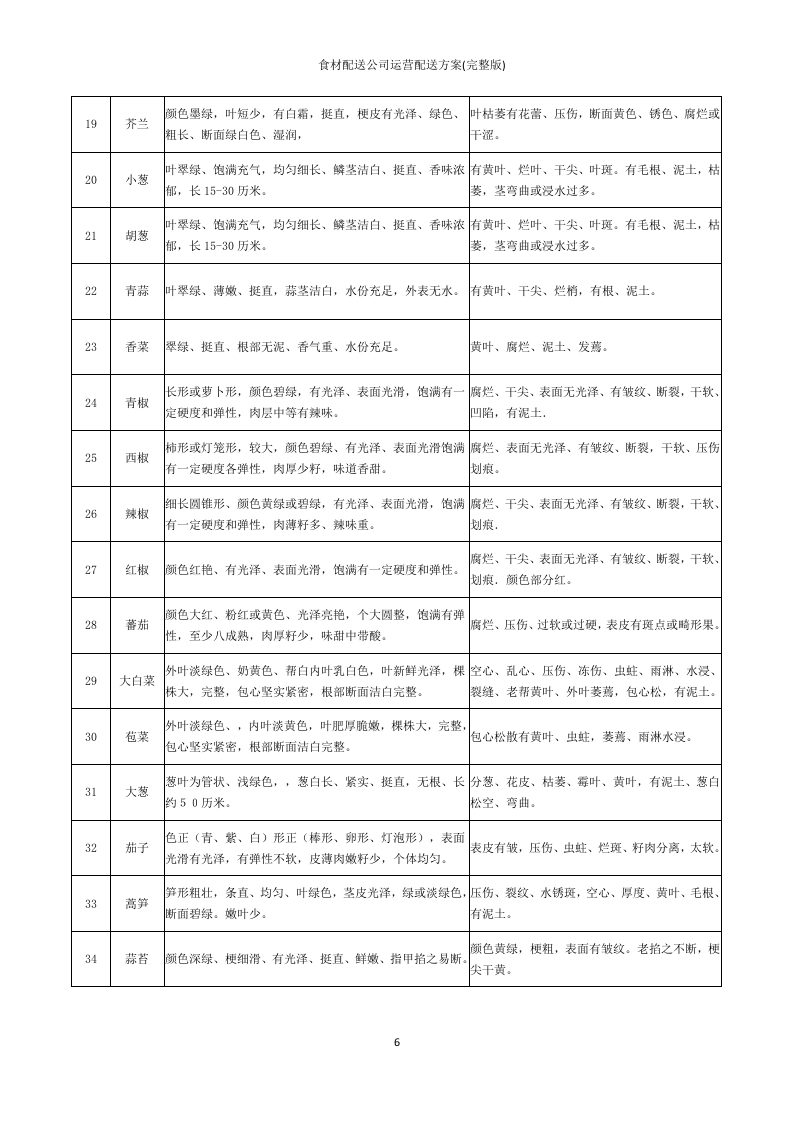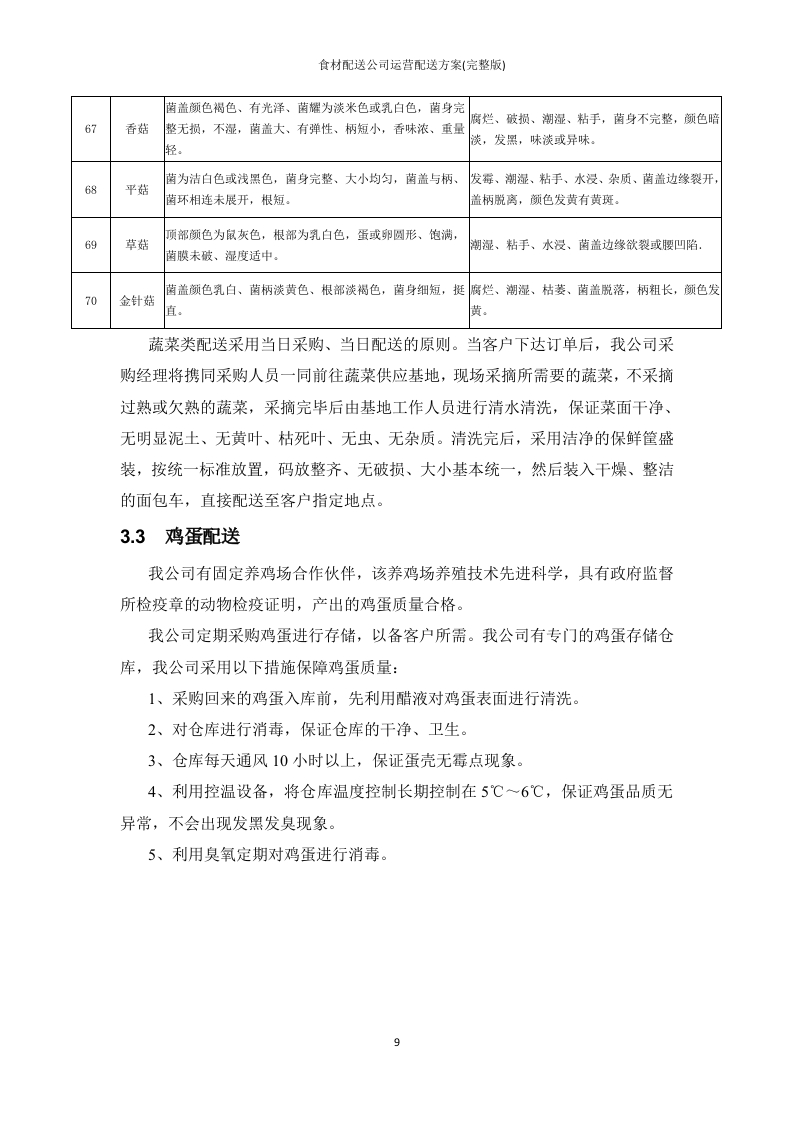食材配送公司运营配送方案(完整版)食材配送公司运营配送方案供应产品规格标准项目技术、规格、质量要求及包装标准备注猪肉:净瘦肉、后腿肉、猪肝、排骨、猪油、筒子骨、猪血等:须保证供应为屠宰厂当日屠宰的猪肉,肉身须盖有卫生检疫章,须出具加盖国家或地方政府监督所检疫章动物检疫证明。肉品须表皮洁净、膘厚适中、色泽鲜亮、纹理清晰、肉质细腻、无异味、去骨、无毛、按肉类压无水迹牛肉:肉身须盖有卫生检疫章,须出具加盖国家或地方政府监督所检疫章的动物检疫证明,肉品须色泽鲜亮、无任何异味、按压无水迹。纹理清晰,肉质细腻,品质好当季各类新鲜蔬菜以及大棚种植蔬菜,蔬菜类必须保证无黄叶、枯死叶、无虫、无杂质,须48小时内采摘供应,原菜须保证菜面干净、所有商蔬菜类无明显泥土、码放整齐、无破损、大小基本统一、不得过熟或欠熟:品必须净菜须保证菜面完全干净、无泥土、按统一标准加工、码放整齐、无满足国须二次处理可以直接进行熟加工家和地鲜新、大小均匀、无破损、色泽光滑,须出具加盖地方政府监督所检鸡蛋方相关疫章的动物检疫证明规定豆腐、豆腐干、绿豆芽、黄豆芽、红豆等:须保证食材干净、不含非豆制品食品用化学物质、按统一标准加工、码放整齐、无须二次处理可以直接进行熟加工当即各类水果,无虫、无杂质,须48小时内采摘供应,原水果须保水果证果面干净、无明显泥土、码放整齐、无破损、大小基本统一、不得过熟或欠熟米线、鲜面条、干面条、饵丝:要求原材料不含非食品用化学物质、米线面不掺假、不过期、不变质、不变味、无杂质、无毒害,符合国家食品条行业的标准大米大米须达国家1354一86特二级标准,水分含量在12°以下,无掺杂、1