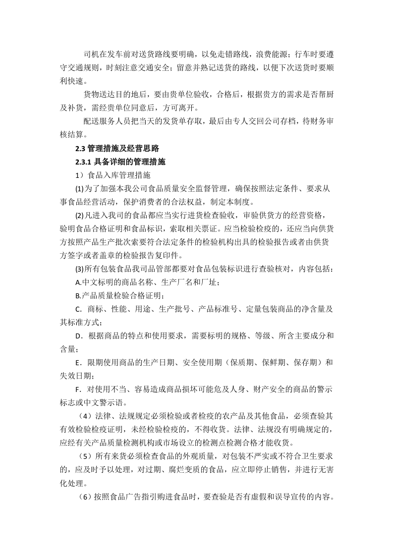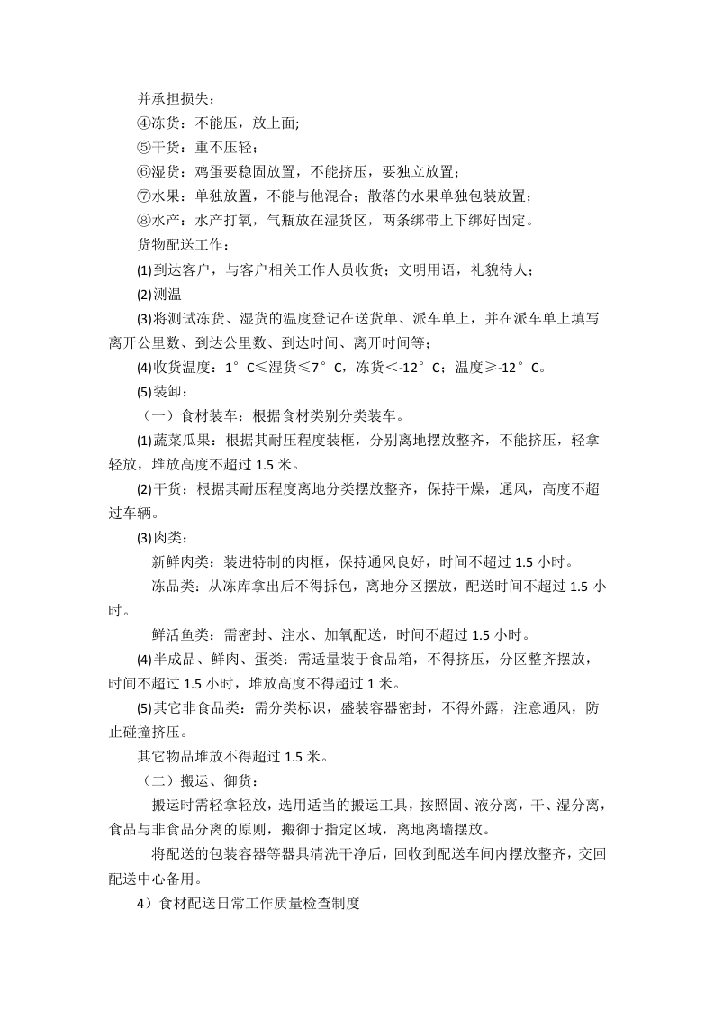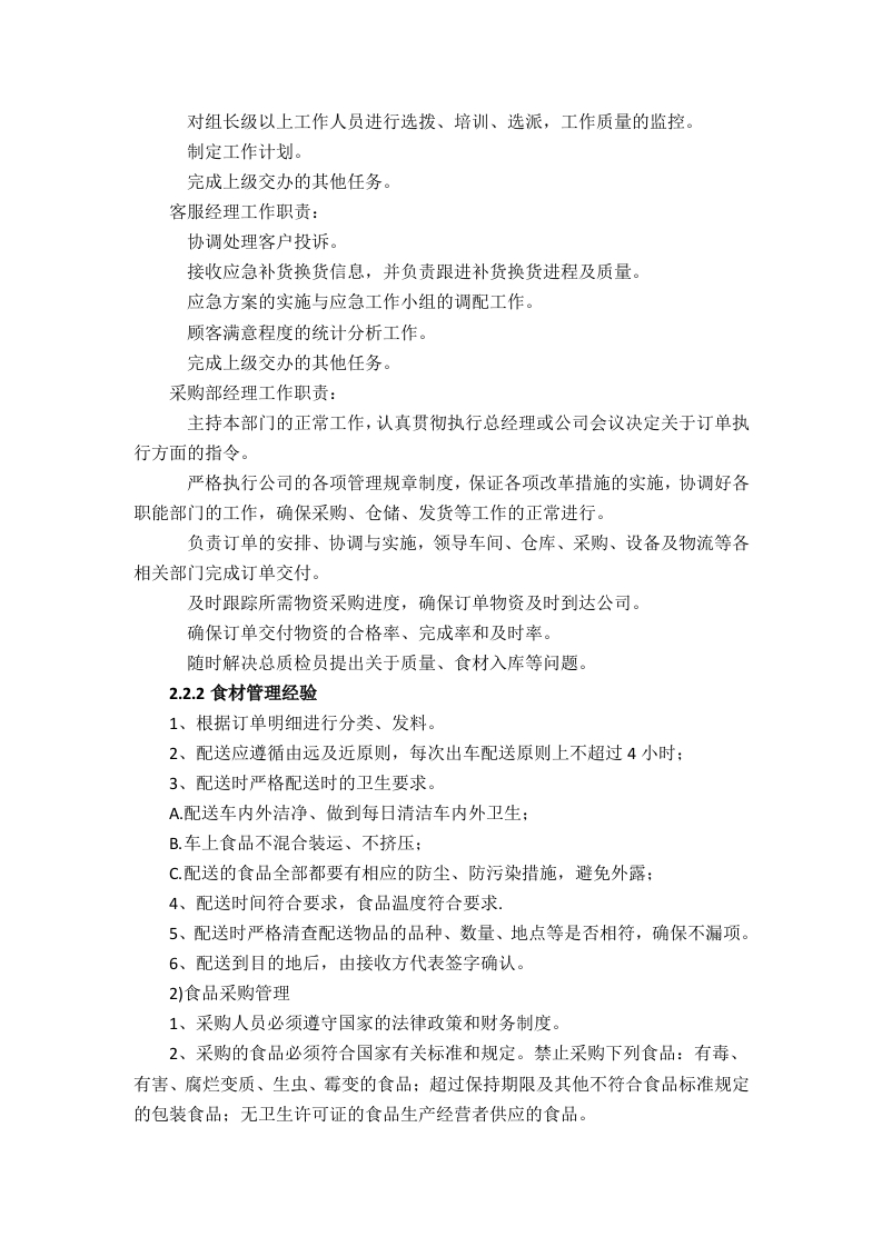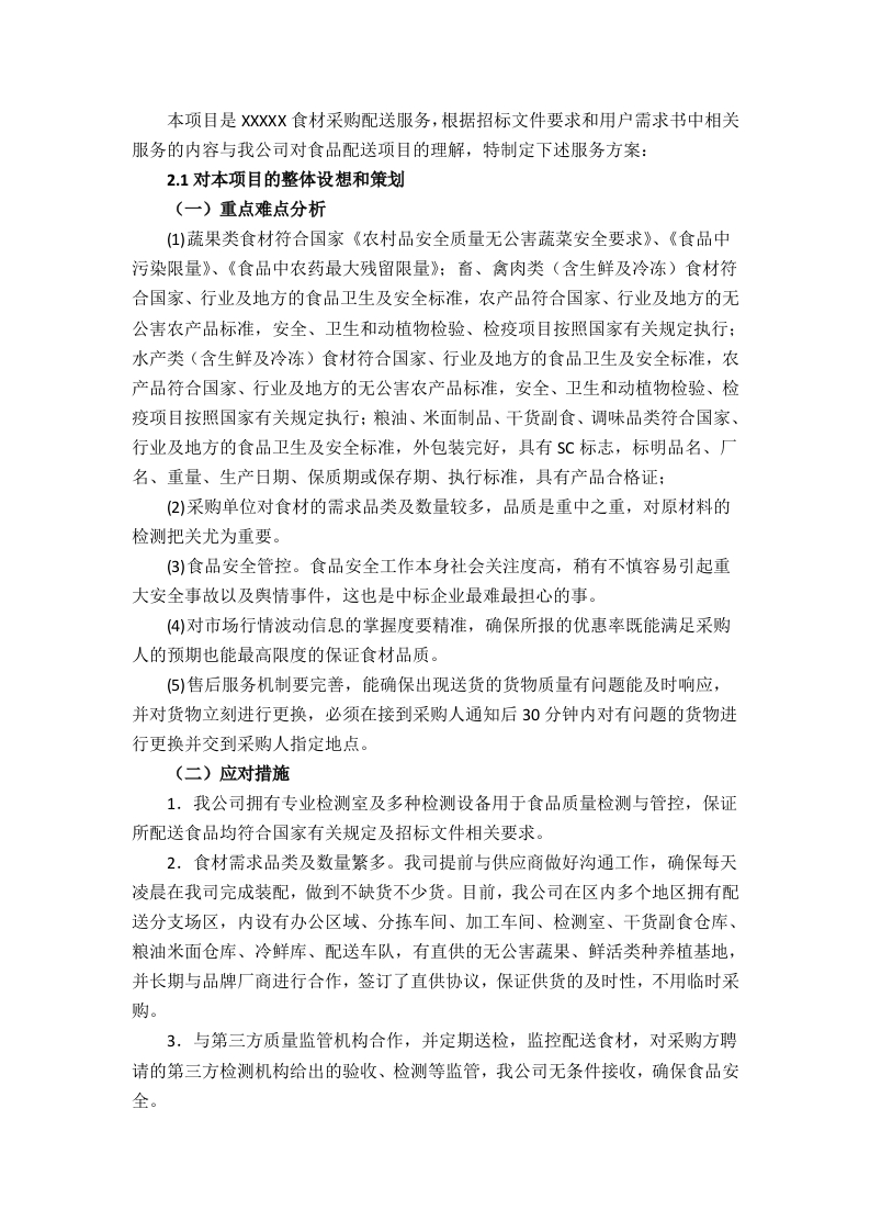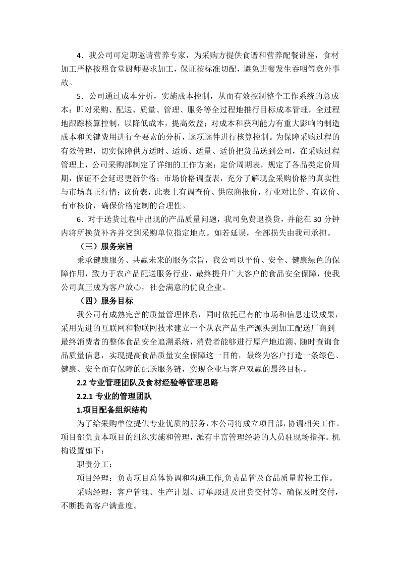 食堂食材配送服务方案二、服务方案及服务承诺.12.1对本项目的整体设想和策划.2(一)重点难点分析…2(二)应对措施.2(三)服务宗旨…3(四)服务目标….32.2专业管理团队及食材经验等管理思路32.2.1专业的管理团队322.2食材管理经验52.3管理措施及经营思路.72.3.1具备详细的管理措施..72.3.2具有良好的价格管控措施…0132.4人员配置情况….142.4.1稳定的专职管理及团队人员.142.4.2配备专职管理员及应急突发问题的措施142.5稳定、及时、完善的物资配送经验.172.5.1配送经验…172.5.2供货便利优势.202.5.3采购备货优势.…202.5.4响应时间及服务承诺242.6健全、规范的管理制度.….252.6.1人员管理制度…252.6.2卫生管理制度.302.6.3安全管理制度…312.6.4物资管理制度.362.6.5出品管理制度.….392.6.6价格管理制度.…402.6.7服务管理制度4327应急预案….452.7.1临时突发订单应急预案.452.7.2缺货应急预案…462.7.3补货应急预案.462.7.4客观不可控应急预案…462.7.5台风天气突发事件应急预案….472.7.6停水突发事件应急保障方案】472.7.7火灾突发事件应急保障方案482.7.8车辆应急保障方案…492.7.9配送人员应急保障方案…492.7.10应急供货渠道说明50