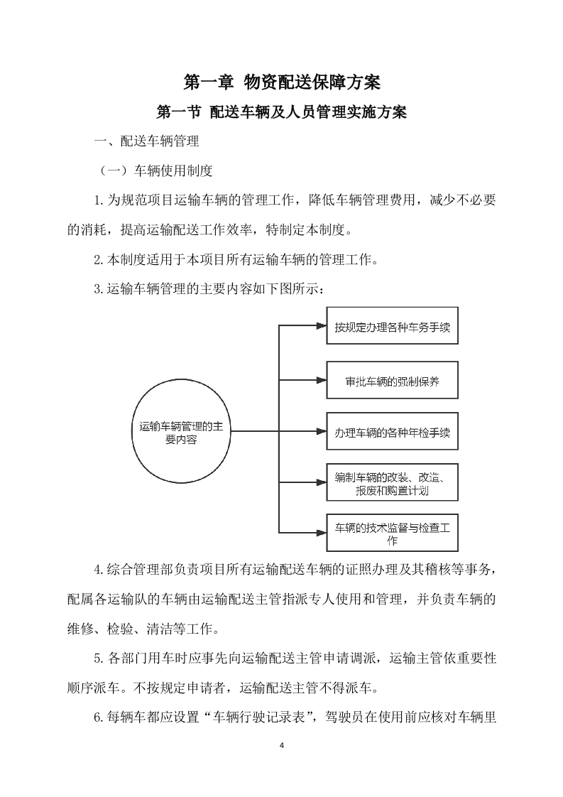 材料采购项目投标方案目录第一章物资配送保障方案…4第一节配送车辆及人员管理实施方案.….4第二节物资配送方案…18第三节配送保障措施…。21第四节物资配送保障实施计划方案26第五节项目运输突发意外应急预案.30第六节配送采购保障方案.32第七节配送采购组织保证措施35第八节配送管理制度38第九节违约责任承诺.39第十节物资质量承诺及出现质量问题的处理措施承诺.…40第十一节运输管理承诺及保证….41第十二节运输人员管理制度.….43第十三节物资运输工具设备管理制度.…70第十四节车辆及驾驶员管理制度77第十五节货物运输突发事件处理预案.84第二章售后服务支持.…..93第一节售后服务承诺93第二节售后服务原则及宗旨…95第三节售后服务计划..971