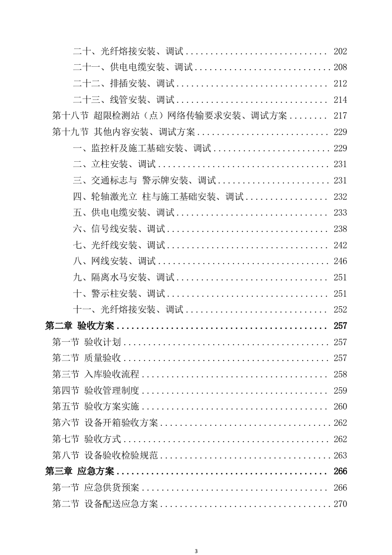 设备采购及安装实施方案目录第一章整体供货方案....。5第一节需耗材的备货方案..·第二节设备运输及备货方案..第三节安装、调试实施方案....24第四节货物的包装方案.·.·26第五节货物配送保管方案.·.··28第六节所需耗材的备货的质量保证措施...30第七节供货投入的信息技术及维保人员作业分工明确,工作经验程度、服务响应及态度的保障...33第八节作业人员分工35第九节针对本项目提出合理化建议和有利招标人的意见..·....·...37第十节人员配备、配送方案....38第十一节采购人需求的时间安排67第十二节安装调试进度控制措施..·71第十三节设备安装调试技术方案...·...73第十四节质量管理的方针、目标和承诺...80第十五节超限检测站(点)内设备安装、调试方案....」81一、称重检测设备安装、调试...·81二、轮轴识别设备安装、调试...85三、车牌识别及抓拍设备安装、调试..86四、语音广播系统设备安装、调试..·.·。91五、称重信息显示设备安装、调试..··98六、前置工控机设备安装、调试..103七、电子围栏监控设备安装、调试.··107八、车辆外廓尺寸检测设备安装、调试.····112