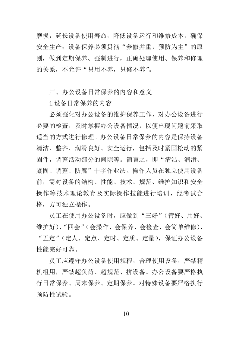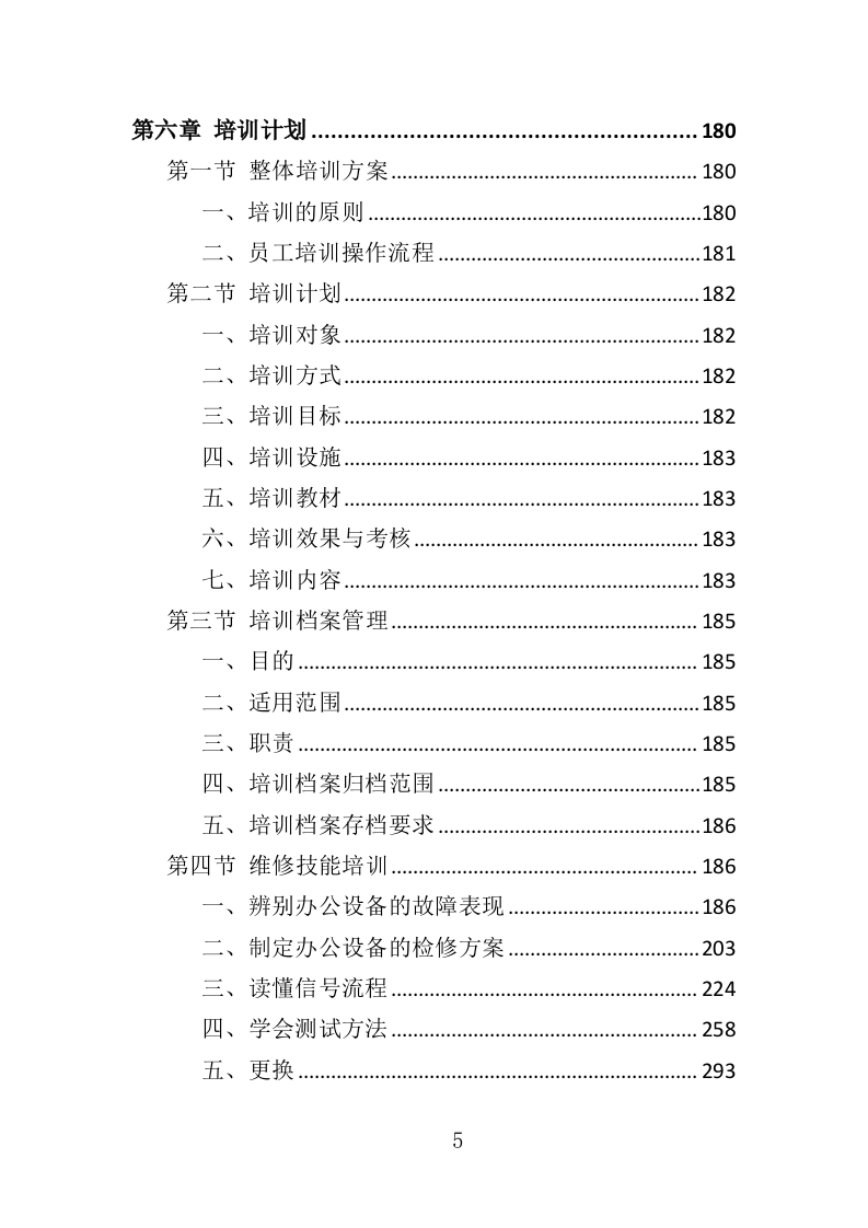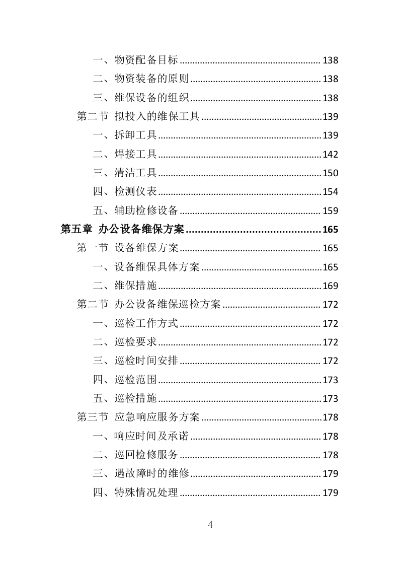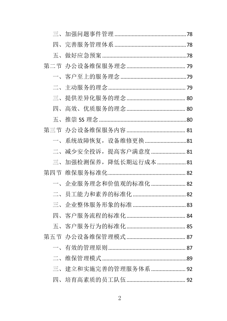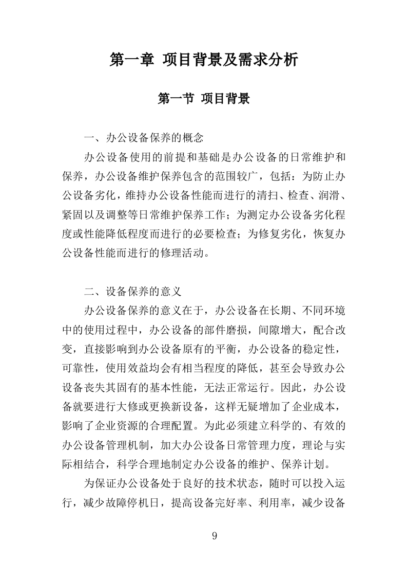 办公设备维保服务投标方案目录第一章项目背景及需求分析..9第一节项目背景.…9一、办公设备保养的概念.9二、设备保养的意义…9三、办公设备日常保养的内容和意义…10四、办公设备例行保养的内容及意义.11第二节主要办公设备使用及维护知识.13一、打印机13二、复印机42三、速印机54四、传真机.63五、扫描仪…65第三节项目需求分析….73一、项目概况。..73二、服务内容.73三、服务要求..74四、售后服务及其他要求..74五、质量标准、验收条件及标准.76第二章项目总体实施方案…....77第一节办公设备维保服务目标…77一、提供专业维保服务.77二、建立设备配置管理77