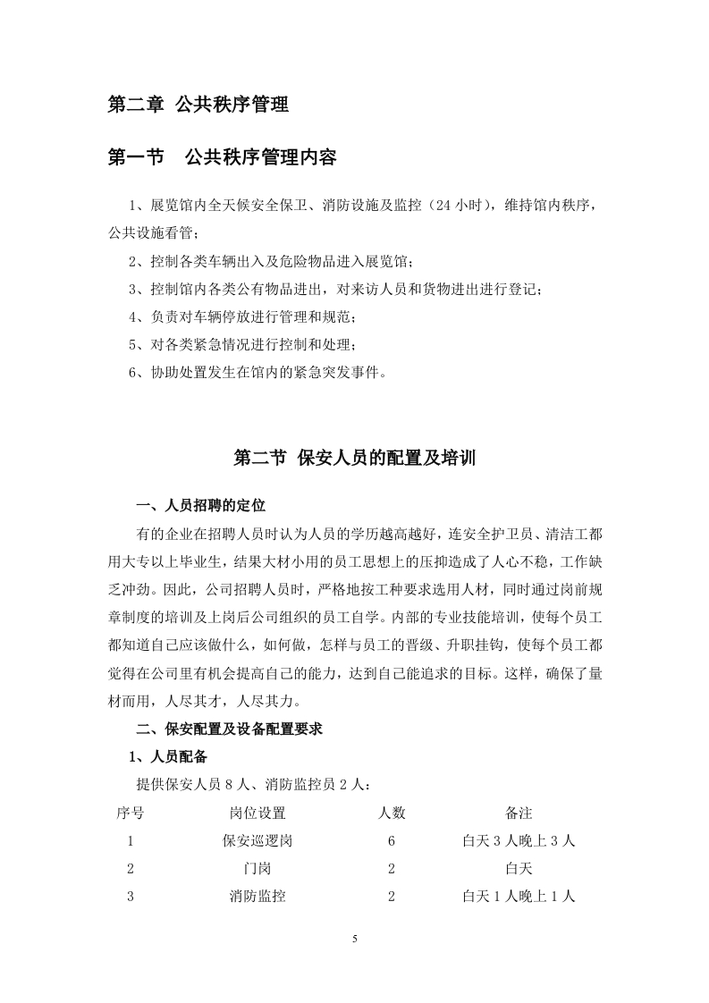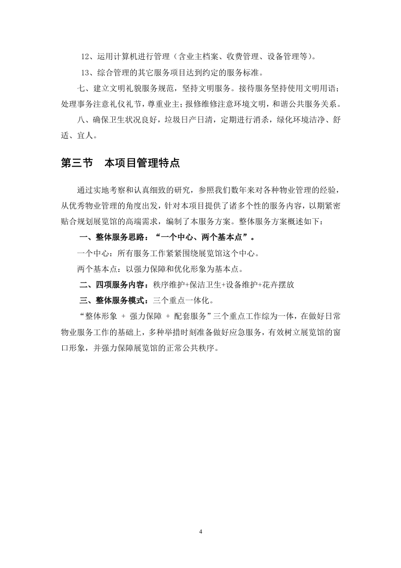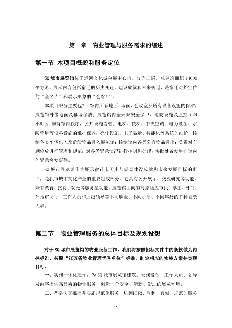 城市展览馆物业管理投标方案目录第一章物业管理与服务需求的综述*2第一节本项目概貌和服务定位…2第二节物业管理服务的总体目标及规划设想…2第三节本项目管理特点…4第二章公共秩序管理,5第一节公共秩序管理内容…5第二节保安人员的配置及培训.5第三节保安管理措施…8第四节保安岗位职责12第五节保安工作流程…17第六节消防管理服务….19第七节节假日及市委、市政府举办活动期间额外增加保安方案…21第八节安保突发事件应急处理预案…。22第九节保安工作的监督检查措施33第十节奖惩条例…。.34第三章保洁管理方案.….37第一节保洁范围及服务特点分析….37第二节保洁人员配置及要求38第三节保洁工作规程及标准….39第四节花木摆放及管理…。56第五节不锈钢的日常清洁….58第六节垃圾收集与清理…59第七节特殊季节、施工期的人性化保洁…60第八节保洁工作流程图….61第九节保洁员行为规范.65第十节保洁岗位职责68第十一节会务服务.2第十二节节假日及市委、市政府举办大型活动期间保洁方案…73第十三节保洁突发事件应急预案.73第十四节保洁工作内部质量监督及外部考核…78第十五节奖惩条例82第四章设备设施的日常维护维修管理.86第一节设施设备维护维修人员配置要求…86第二节设备设施服务标准及制度.86第三节工程维护人员内部考核内容、标准及方法…95第四节设备服务作业规程及服务方案…96第五节设备故障应急处理预案…。…102
