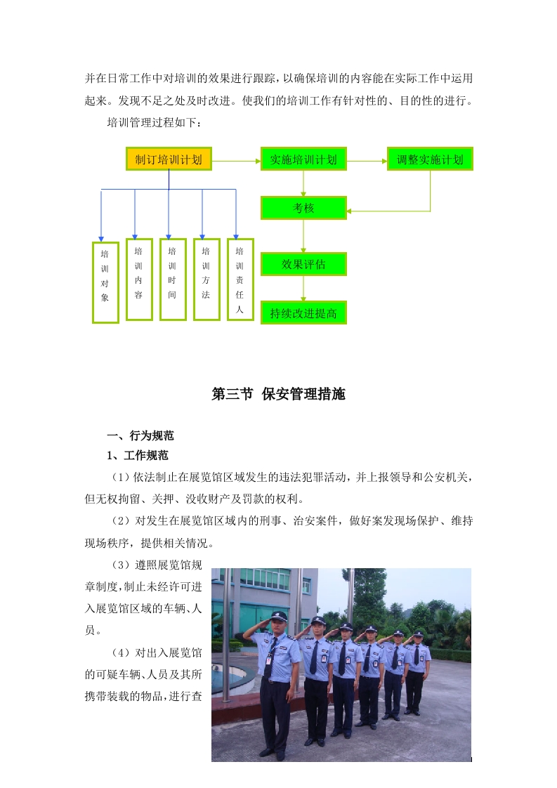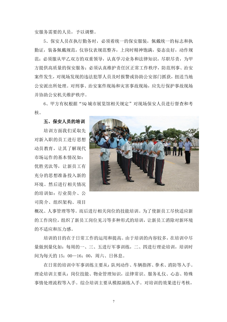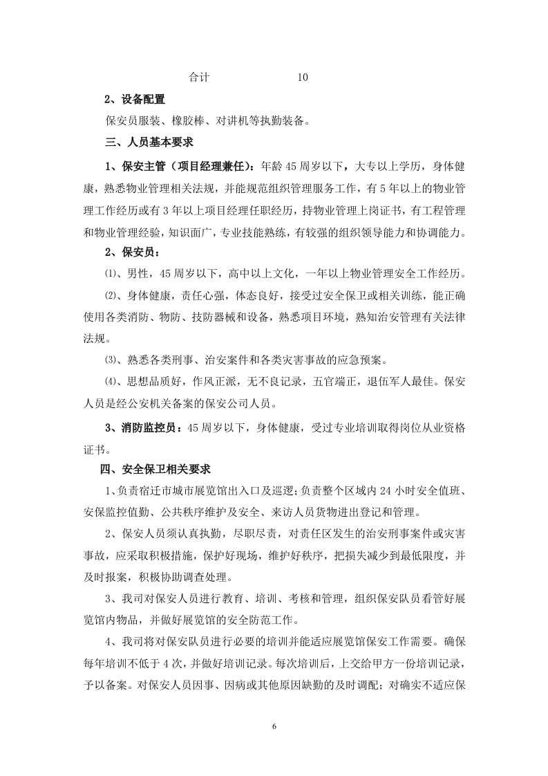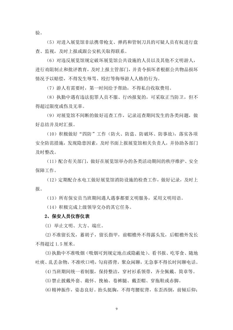 城市展览馆物业管理投标方案目录第一章物业管理与服务需求的综述*2第一节本项目概貌和服务定位…2第二节物业管理服务的总体目标及规划设想…2第三节本项目管理特点…4第二章公共秩序管理,5第一节公共秩序管理内容…5第二节保安人员的配置及培训.5第三节保安管理措施…8第四节保安岗位职责12第五节保安工作流程…17第六节消防管理服务….19第七节节假日及市委、市政府举办活动期间额外增加保安方案…21第八节安保突发事件应急处理预案…。22第九节保安工作的监督检查措施33第十节奖惩条例…。.34第三章保洁管理方案.….37第一节保洁范围及服务特点分析….37第二节保洁人员配置及要求38第三节保洁工作规程及标准….39第四节花木摆放及管理…。56第五节不锈钢的日常清洁….58第六节垃圾收集与清理…59第七节特殊季节、施工期的人性化保洁…60第八节保洁工作流程图….61第九节保洁员行为规范.65第十节保洁岗位职责68第十一节会务服务.2第十二节节假日及市委、市政府举办大型活动期间保洁方案…73第十三节保洁突发事件应急预案.73第十四节保洁工作内部质量监督及外部考核…78第十五节奖惩条例82第四章设备设施的日常维护维修管理.86第一节设施设备维护维修人员配置要求…86第二节设备设施服务标准及制度.86第三节工程维护人员内部考核内容、标准及方法…95第四节设备服务作业规程及服务方案…96第五节设备故障应急处理预案…。…102