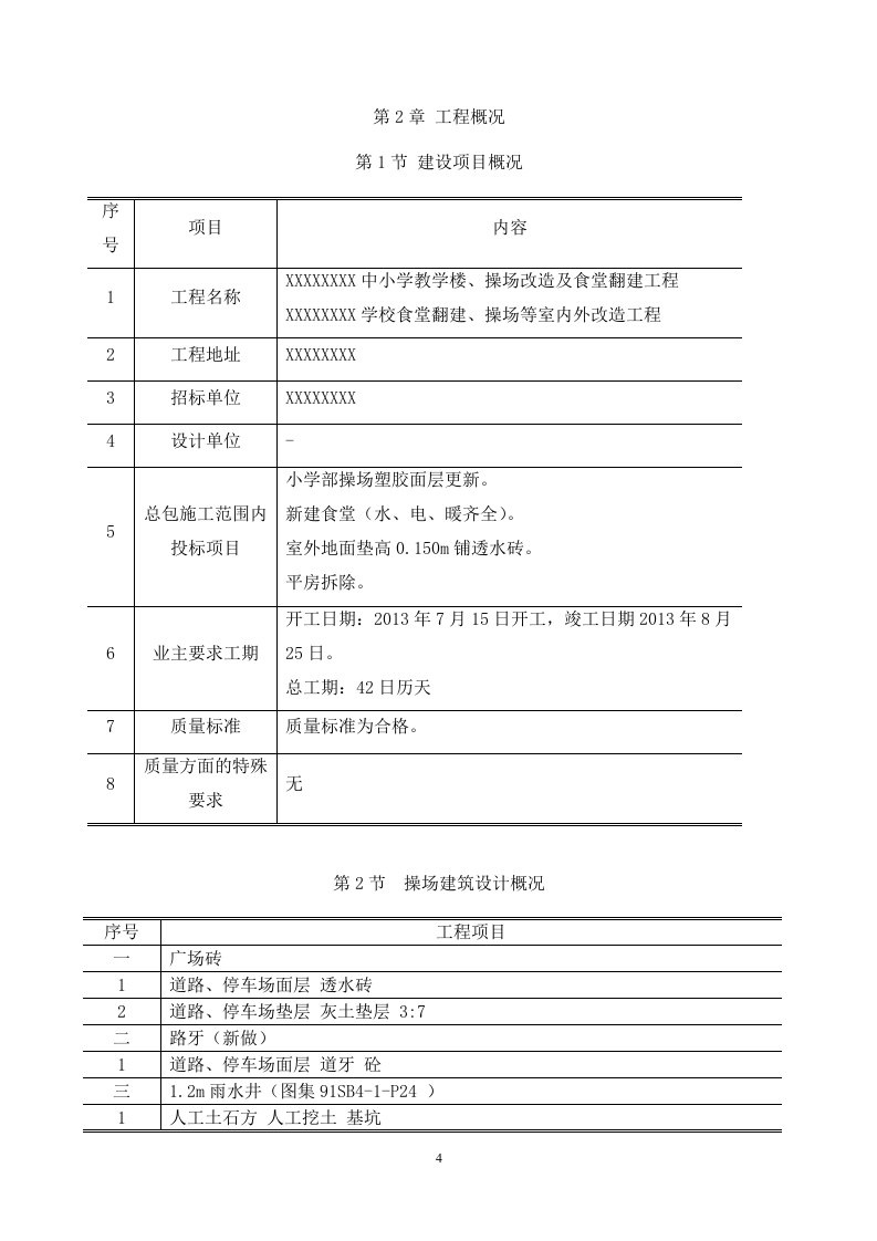 学校食堂翻建施工组织设计目录第】章编制依据…第2章工程概况..4第1节建设项目概况….4第2节操场建筑设计概况.4第3节操场市政设计概况.5第4节隔油池建筑设计概况…第5节食堂拆除设计概况.6第6节食堂建筑设计概况.6第7节食堂装饰设计概况..8第8节食堂电气设计概况.9第9节食堂给排水设计概况。.11第10节食堂采暖设计概况.…。12第3章工程特点、难点分析及对策第4章总体部署….13.15第1节总体施工设想15第2节施工现场组织管理机构….15第3节施工总体目标…18第4节总体施工安排的原则..19第5节总承包方与指定分包单位的配合与协调22第6节劳动力的组织….25第7节施工机械的选择,27第8节分包计划….27第9节验收安排…28第10节施工现场组织协调29第11节施工原则.…30第5章施工准备.31第1节技术准备.31第2节生产准备….36