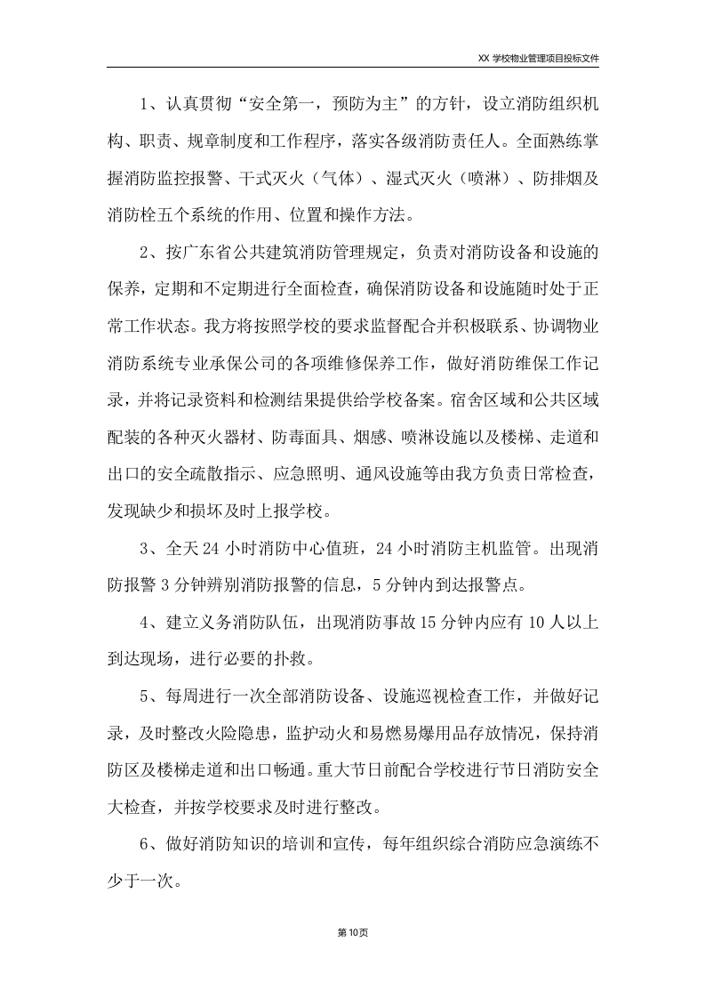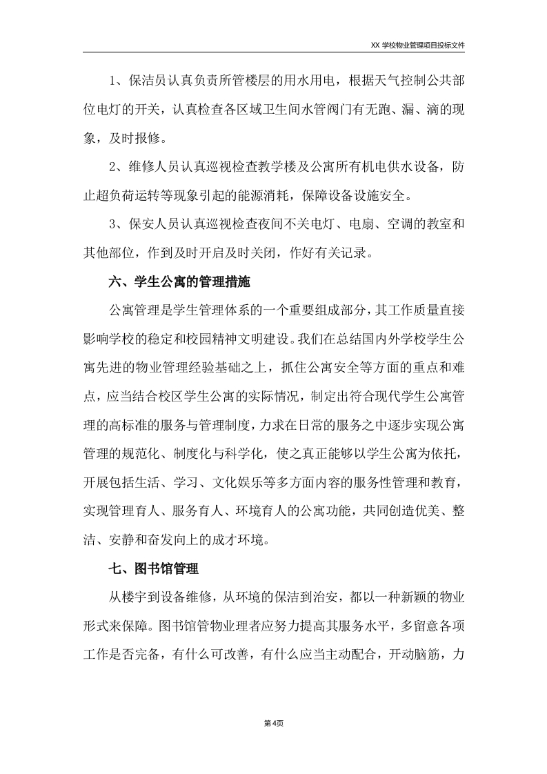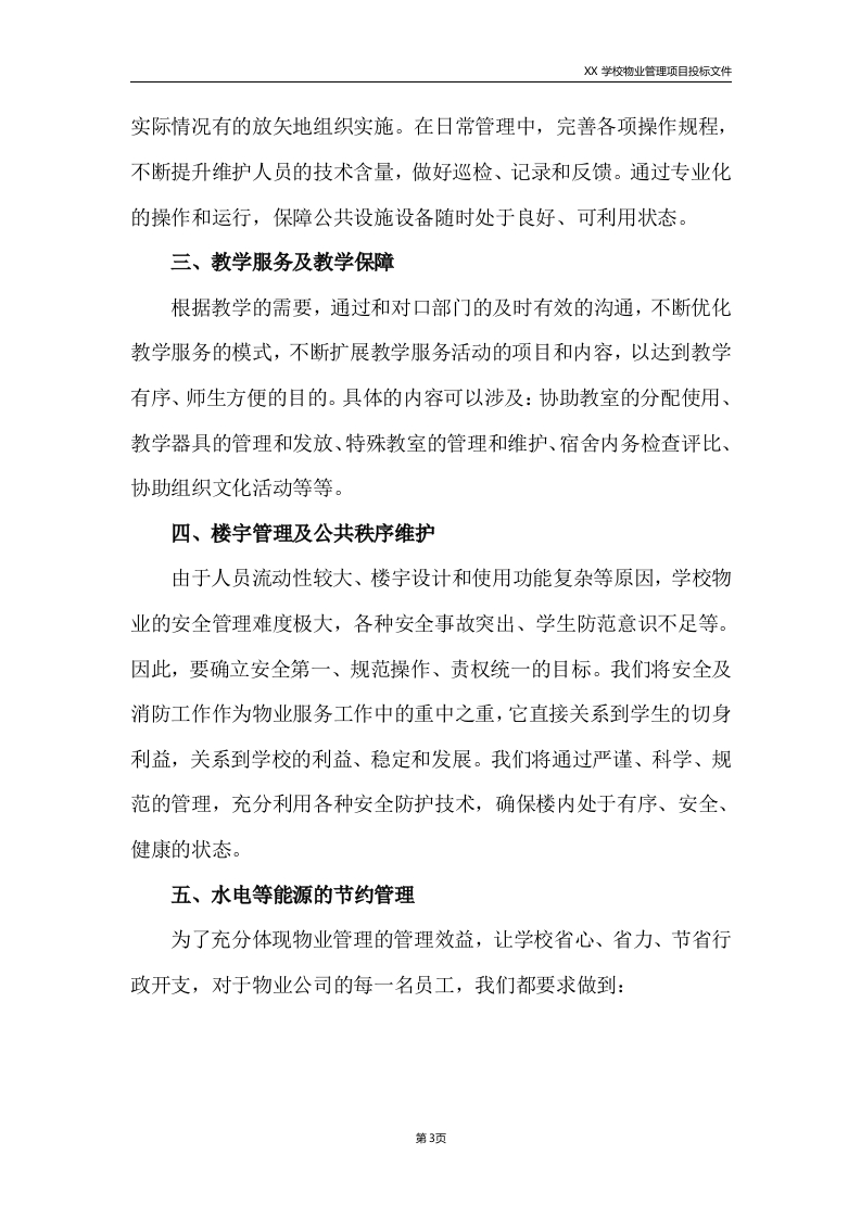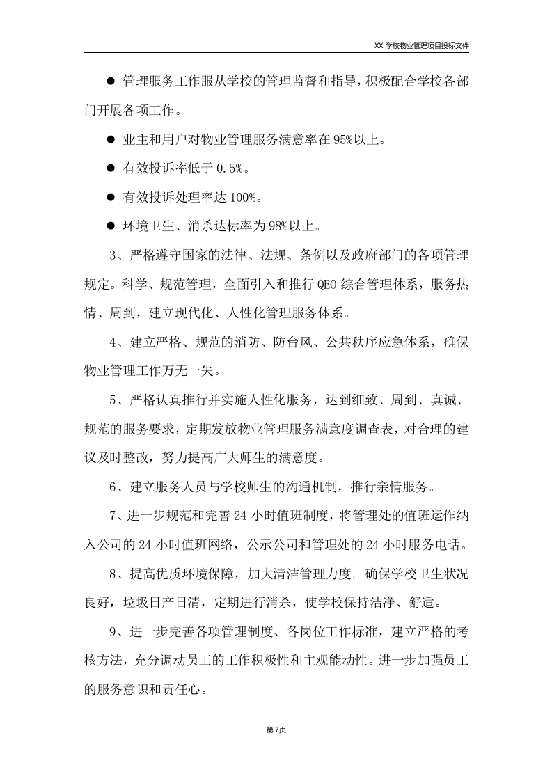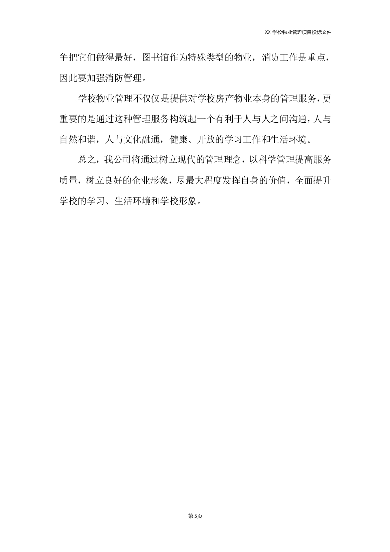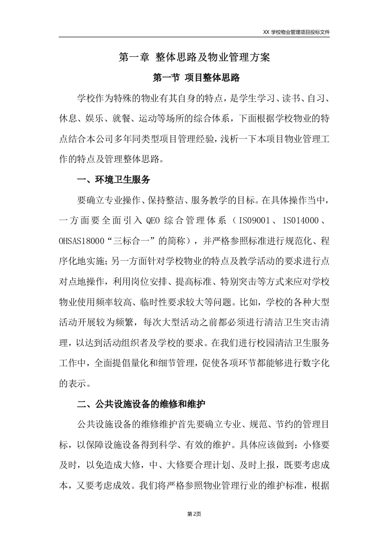 X学校物业管理项目投标文件学校物业管理投标方案第一章整体思路及物业管理方案。.2第一节项目整体思路第二节物业管理方案.6一、服务工作目标.6二、管理项目内容8三、管理方案24第二章物业管理方式….135一、组织结构设立.135二、服务人员配备(共X人).135三、管理处内部组织运作流程136四、人员管理机制.144第三章管理人员培训方案。.147一、培训目标。148二、培训方式148三、培训评估考核。148四、培训计划…148第四章管理工作必须的物质装备计划情况,154一、管理服务用房安排154二、每月计创使用主要清洁物料清单」.154三、拟投入本项目的主要设备、工具、器械明细表156第五章管理规章制度.162一、岗位职责162二、服务人员的管理166三、工作纪律….171第大章物业管理档案制度180一、档案资料管理。..180二、工作档案建立182三、记录控制程序182第七章各项管理指标承诺,185第1页