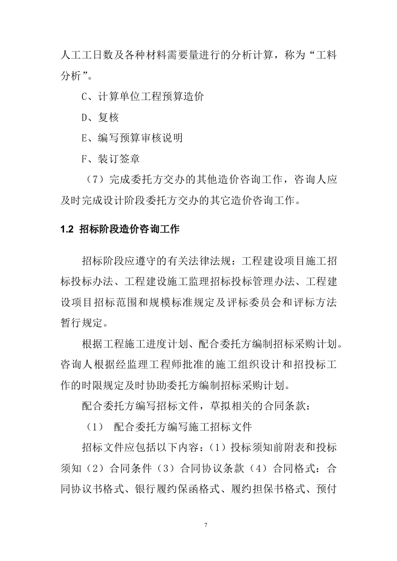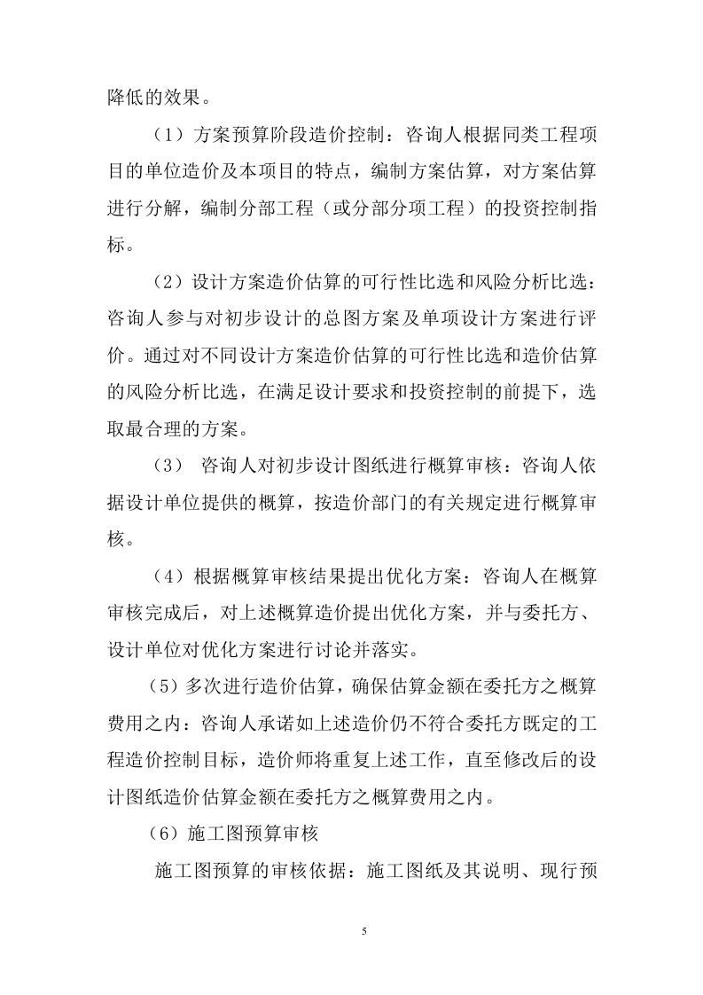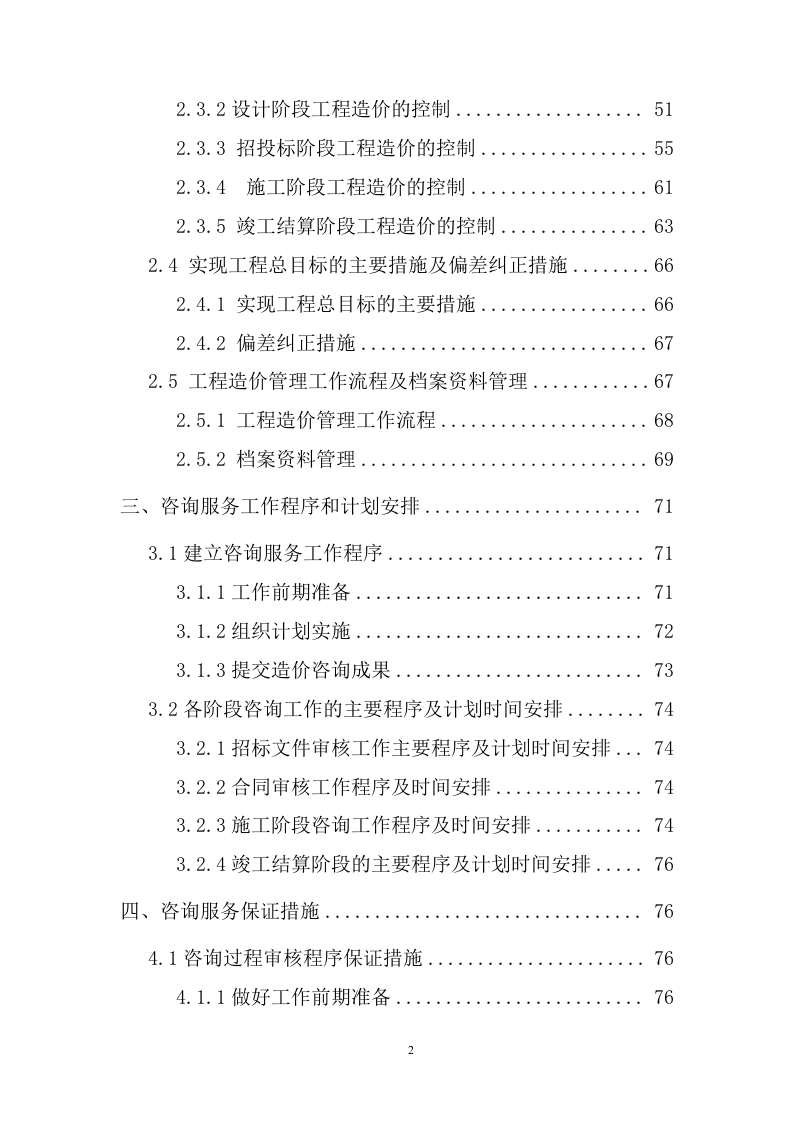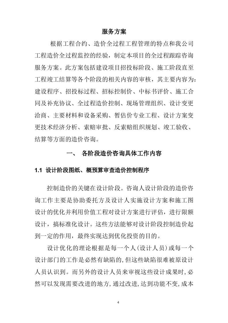 造价咨询服务方案目录一、各阶段造价咨询具体工作内容.·..·31.1设计阶段图纸、概预算审查造价控制程序......31.2招标阶段造价咨询工作.....1.3施工阶段造价控制..·1.4竣工结算阶段的审核内容.…241.5合同管理及控制.......28二、造价控制大纲及控制措施.392.1造价确定和控制的重点、难点分析..392.1.1投资决策阶段....392.1.2设计阶段..402.1.3建设项目发包阶段..........412.1.4施工阶段....432.1.5指定分包是造价管理的难点........·442.1.6竣工结算阶段...·452.2造价控制的指导思想、控制的阶段性目标和总目标.·462.2.1招标阶段投资控制目标…472.2.2施工阶段的投资控制目标......482.2.3竣工结算阶段投资控制目标.…482.2.4竣工决算阶段投资控制目标..…482.3实现阶段性控制目标的工程造价控制的措施....·492.3.1决策阶段工程造价的控制.........·491