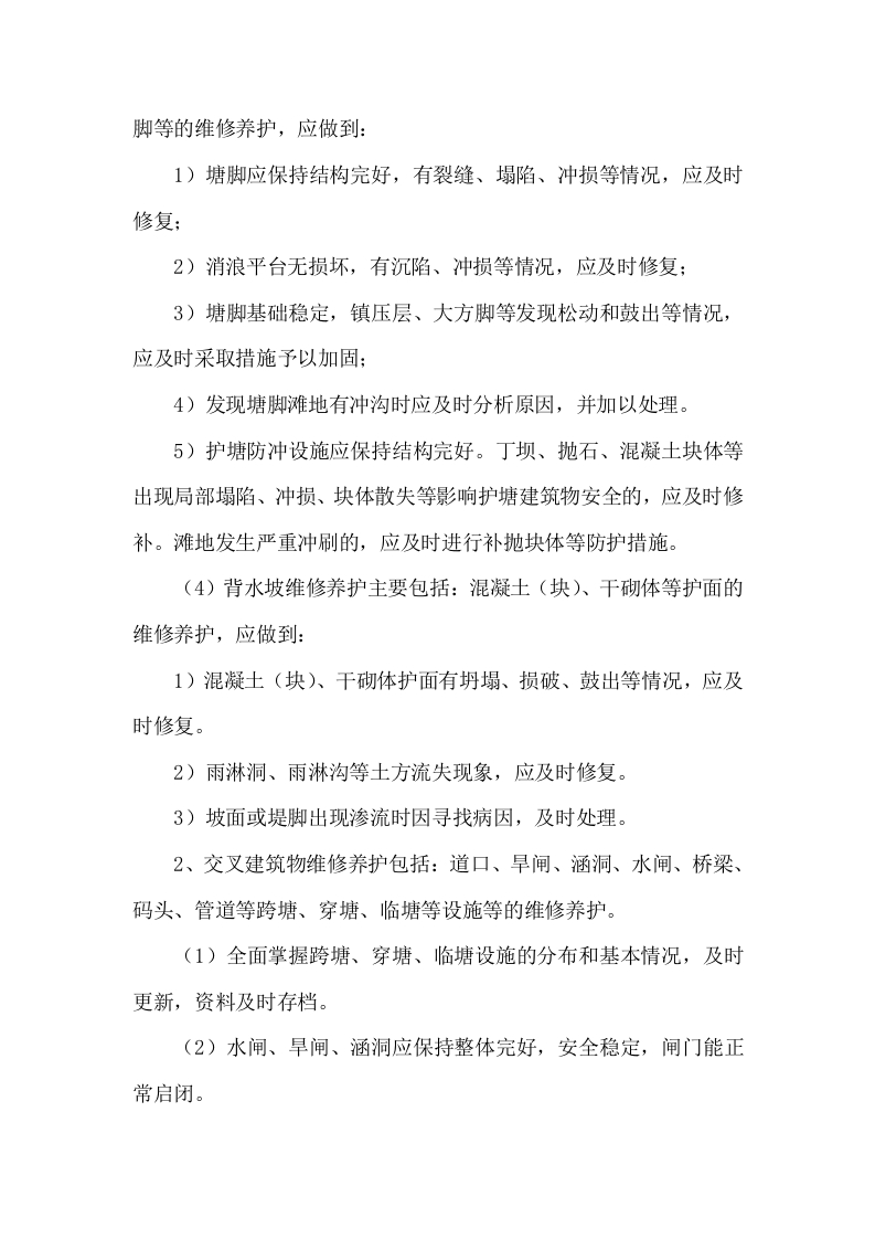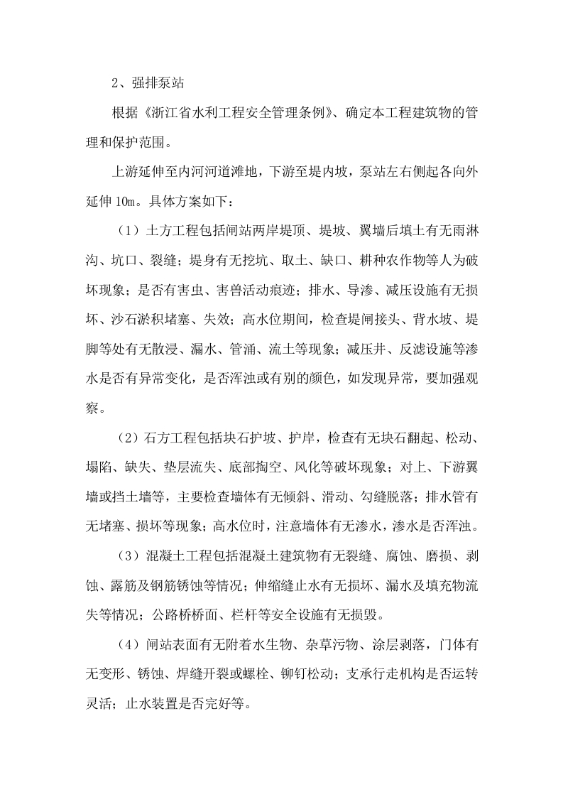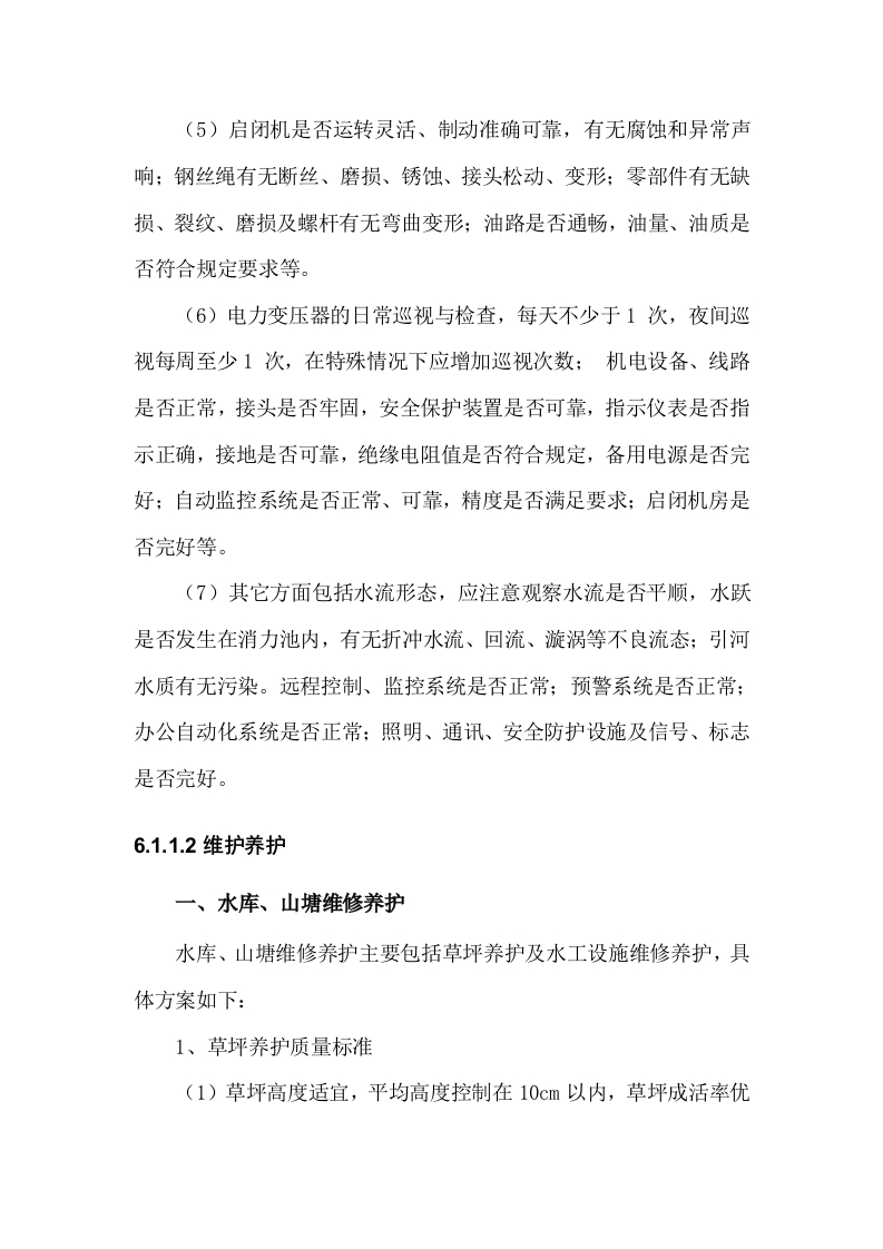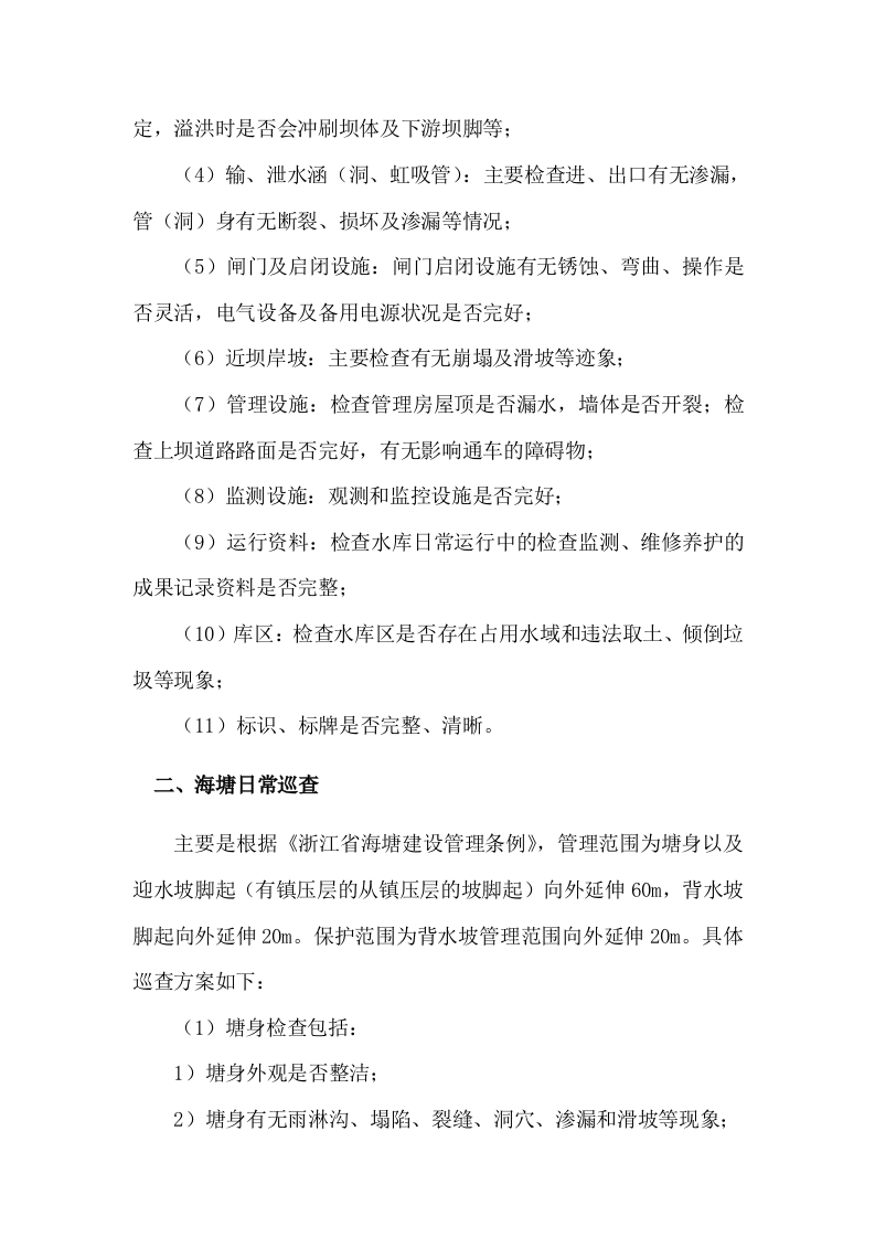 水利工程运维技术文件(堤防、闸站、泵站)6.1整体项目服务方案、服务指标及措施6.1.1项目服务方案本项目服务方案主要包括所有水库、海塘、水闸、强排泵站日常运行管理、巡查、保洁、安全与治安管理、数据录入平台、运管平台运行服务等内容,同时按管理规定或规程做好检查记录,省市县区各管理平台系统上传等工作。严格对照执行《浙江省小型水库安全运行管理规定》、《浙江省海塘工程运行管理规程(试行)》、《浙江省泵站运行管理规程(试行)》、《浙江省大中型水闸运行管理规程》。6.1.1.1日常巡查一、水库、山塘巡查主要对坝体、坝址区、溢洪道、输(泄)水涵(管、洞)、管埋设施、运行资料、监测设施以及近坝岸坡和库区等进行巡查。具体巡查方案如下:(1)坝体:主要检查有无渗漏、裂缝、塌坑、凹陷、隆起、蚁害及动物洞穴:近坝水面有无冒泡、漩涡等异常现象等:(2)坝址区:主要检查有无渗漏、裂缝、塌坑、凹陷、隆起等现象:(3)溢洪道:主要检查有无堵塞、拦鱼网,岸坡及边墙是否稳