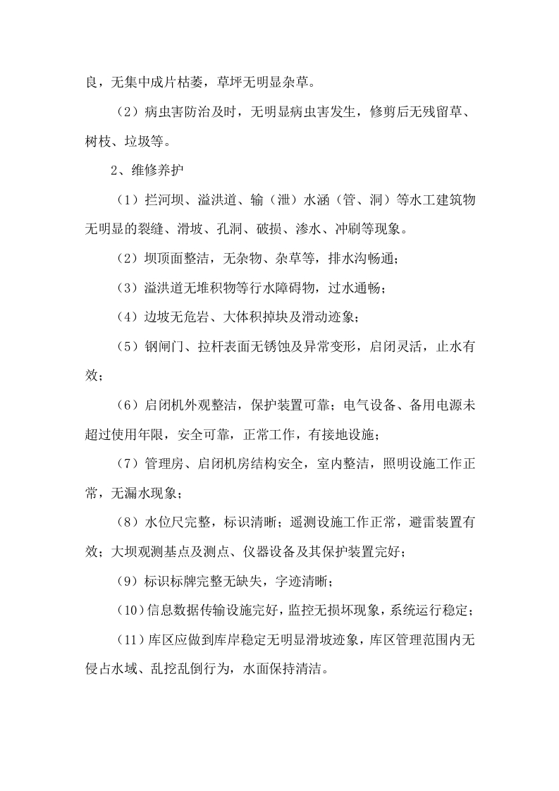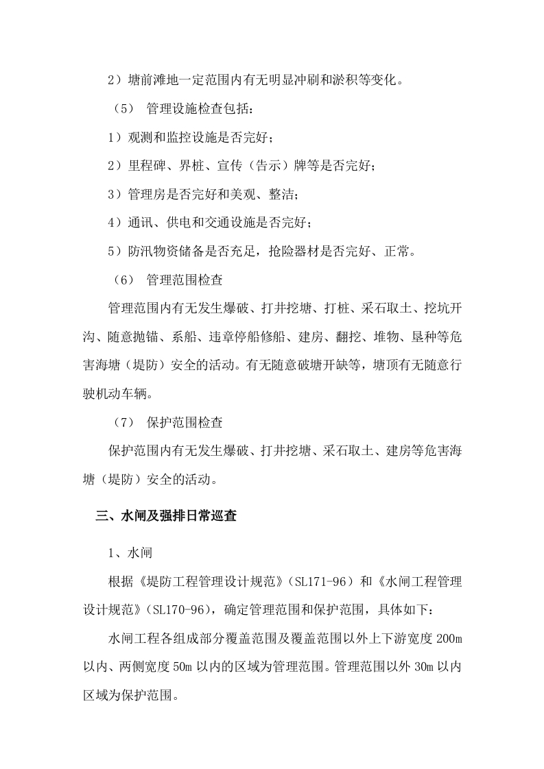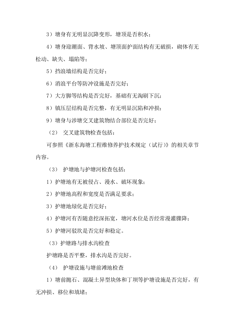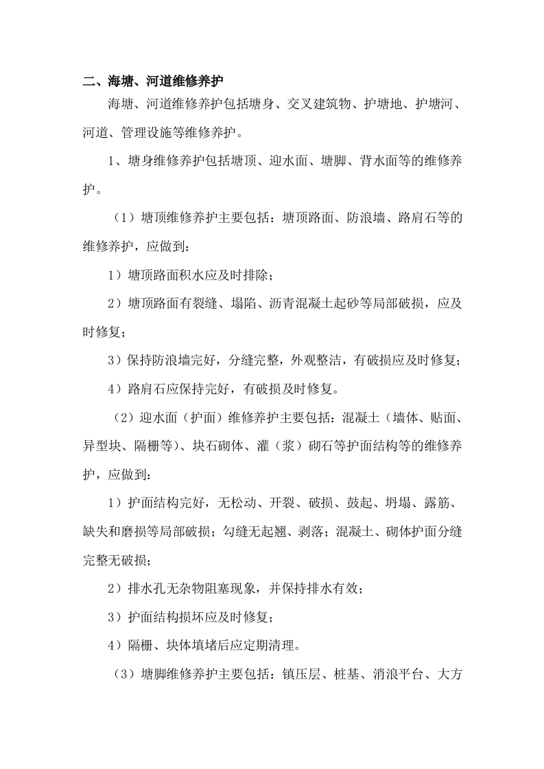 水利工程运维技术文件(堤防、闸站、泵站)6.1整体项目服务方案、服务指标及措施6.1.1项目服务方案本项目服务方案主要包括所有水库、海塘、水闸、强排泵站日常运行管理、巡查、保洁、安全与治安管理、数据录入平台、运管平台运行服务等内容,同时按管理规定或规程做好检查记录,省市县区各管理平台系统上传等工作。严格对照执行《浙江省小型水库安全运行管理规定》、《浙江省海塘工程运行管理规程(试行)》、《浙江省泵站运行管理规程(试行)》、《浙江省大中型水闸运行管理规程》。6.1.1.1日常巡查一、水库、山塘巡查主要对坝体、坝址区、溢洪道、输(泄)水涵(管、洞)、管埋设施、运行资料、监测设施以及近坝岸坡和库区等进行巡查。具体巡查方案如下:(1)坝体:主要检查有无渗漏、裂缝、塌坑、凹陷、隆起、蚁害及动物洞穴:近坝水面有无冒泡、漩涡等异常现象等:(2)坝址区:主要检查有无渗漏、裂缝、塌坑、凹陷、隆起等现象:(3)溢洪道:主要检查有无堵塞、拦鱼网,岸坡及边墙是否稳