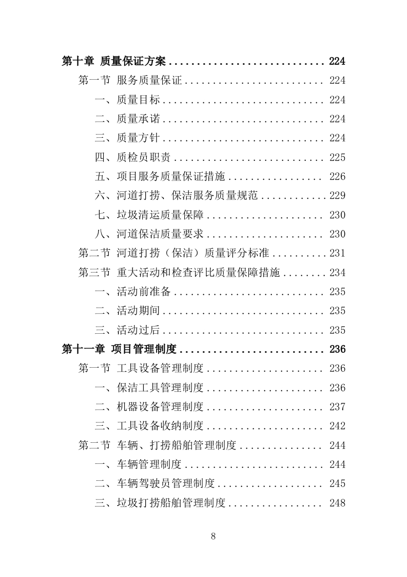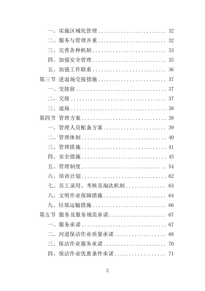 河道市场化运作投标方案目录第一章项目背景及需求分析.·15第一节项目背景....15一、河道治理的必要性.·..15二、河道治理修复的原则....16三、当前河道治理存在的问题..··17四、提高河道治理的对策.·...·18第二节项目理解.·20一、保洁及保洁服务的概念20二、保洁服务市场运营情况分析.··21第三节项目概况.··.·23一、项目内容及要求..23二、服务期限...24第二章项目整体服务设想..25第一节服务理念及目标..25一、服务理念..25二、作业目标..25三、作业规范.·26四、质量标准..28五、作业内容..29六、作业工具30七、作业方式...31第二节服务设想及重点策划...32