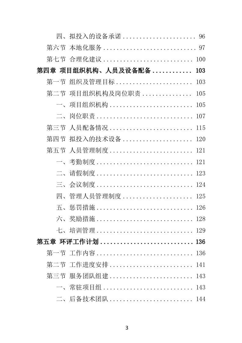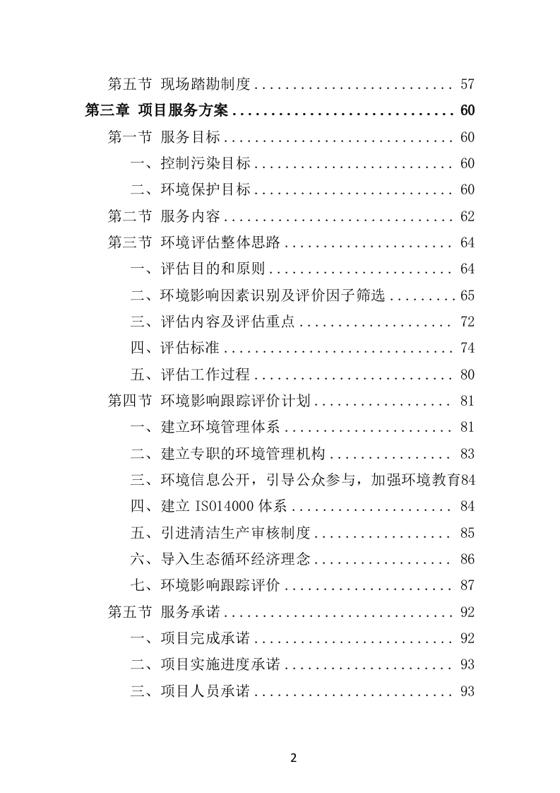 环境影响评估投标方案目录第一章项目背景及需求分析.·,13第一节项目背景....13第二节项目现状...·30第三节项目概况.·33第四节对项目的理解及需求分析.··42一、工作内容及要求42二、技术要求..43三、服务要求..43第二章现场踏勘计划...45第一节现场踏勘总体要求45一、目的与作用...45二、工作目标.45第二节现场踏勘准备..46一、准备事项..·46二、工作组织.47三、注意事项...47第三节现场踏勘时间..48第四节现场踏勘流程.·.,49一、踏勘方式....49二、项目现场踏勘主要内容50三、现场踏勘记录..·52四、与业主交流技术要求..541