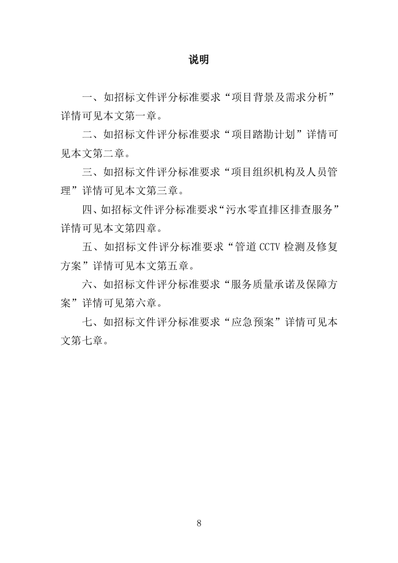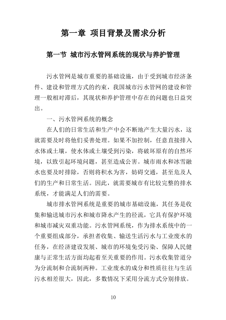 污水零直排区排查服务投标方案目录第一章项目背景及需求分析......10第一节城市污水管网系统的现状与养护管理..·.·10一、污水管网系统的概念..··...10二、污水管网系统的组成....·.11三、污水管网系统的现状....11四、污水管道的养护管理...12第二节项目需求分析..·..15一、排水设施...15二、出具检测报告等成果、修复等.17三、提供排水设施地理信息..·.25第二章现场踏勘计划...26第一节现场踏勘总体要求26一、目的与作用..26二、工作目标..26第二节现场踏勘准备.·27一、准备事项..27二、工作组织..27三、注意事项..28第三节现场踏勘时间.·28第四节现场踏勘流程.·30一、踏勘方式....30二、项目现场踏勘主要内容30