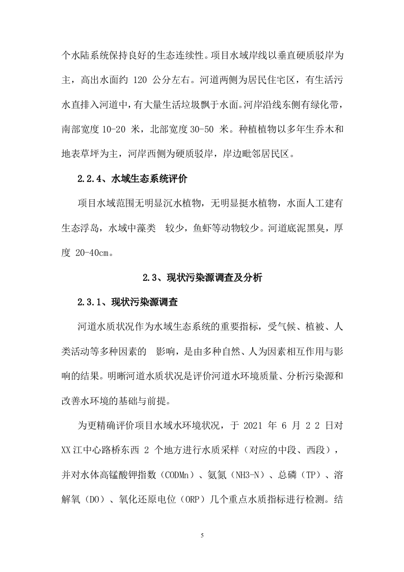 某江水体生态治理项目投标方案目录2、对项目的熟悉程度.·2.1、项目概况...…12.2、对现状水质及周边环境分析......32.3、现状污染源调查及分析52.4、水质最差情况期间的处置措施.·93、关键点难点及解决措施......103.1、水生态修复关键技术.....103.2、DPA微生物驯化富氧净水技术......。113.3、沉水植物水质净化技术...163.4、水生动物多样性构建技术183.5、水生态系统集成技术...214、投入设备及实施方案...224.1、设计思路......224.2、技术路线.…234.3、DPA微生物驯化富氧净水技术...........234.4、菌种培育技术...334.5、沉水植物配置工程.....354.6、水生动物配置设计.....。3947、全生态系统平衡调节.…434.8、施工过程对河流开放性及当前水质提升管理工作的影响性分析4449、验收方案…484.8、拟投入本项目设备设施1044.9、人员配备计划....1054.10、施工方式....1055、养护方案..1065.1、日常巡查方案...106