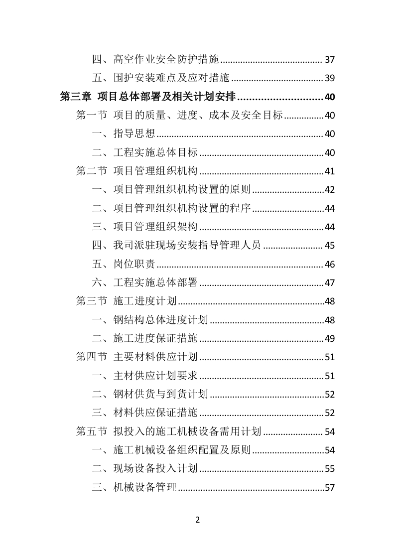 钢结构工程投标方案目录第一章工程概况.….21第一节工程概况21一、工程概况…21二、建筑概况22三、结构概况22第二节设计概况.23一、设计依据。23二、设计重难点分析.25三、设计部署及思路26四、深化设计施工详图.28第二章工程重难点分析及对策.30第一节项目管理重难点分析及解决措施…30一、重难点分析30二、解決措施31第二节钢结构加工制作的重难点分析及应对措施.32一、加工制作的重难点分析…32二、焊接变形控制和制作精度的控制.…34第三节钢结构现场安装重难点及应对措施.36一、现场安装的重难点分析…36二、整体吊装难点分析及应对措施37三、不利条件的安装防护.371