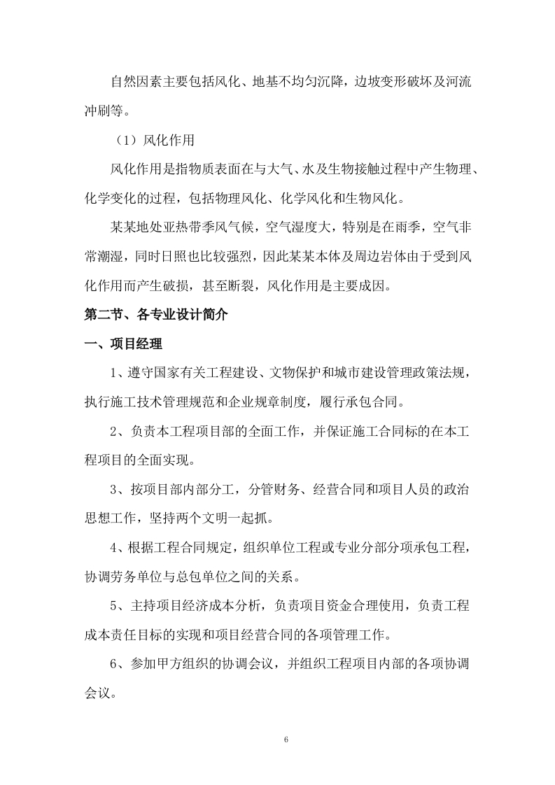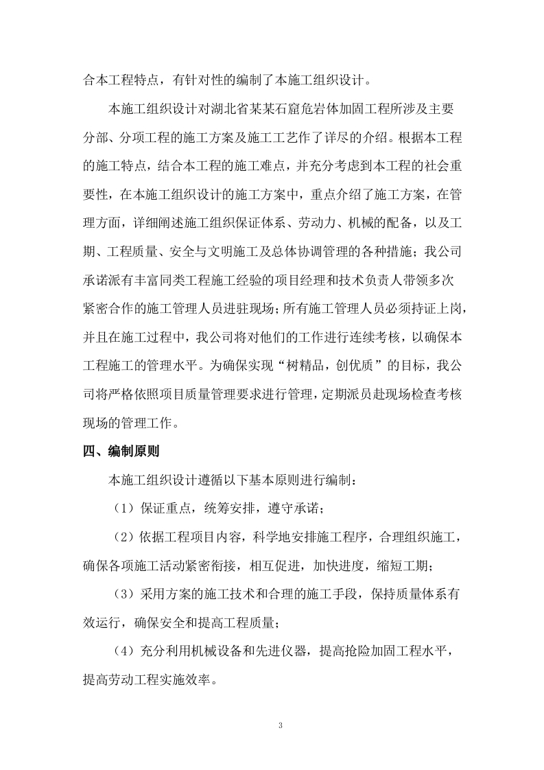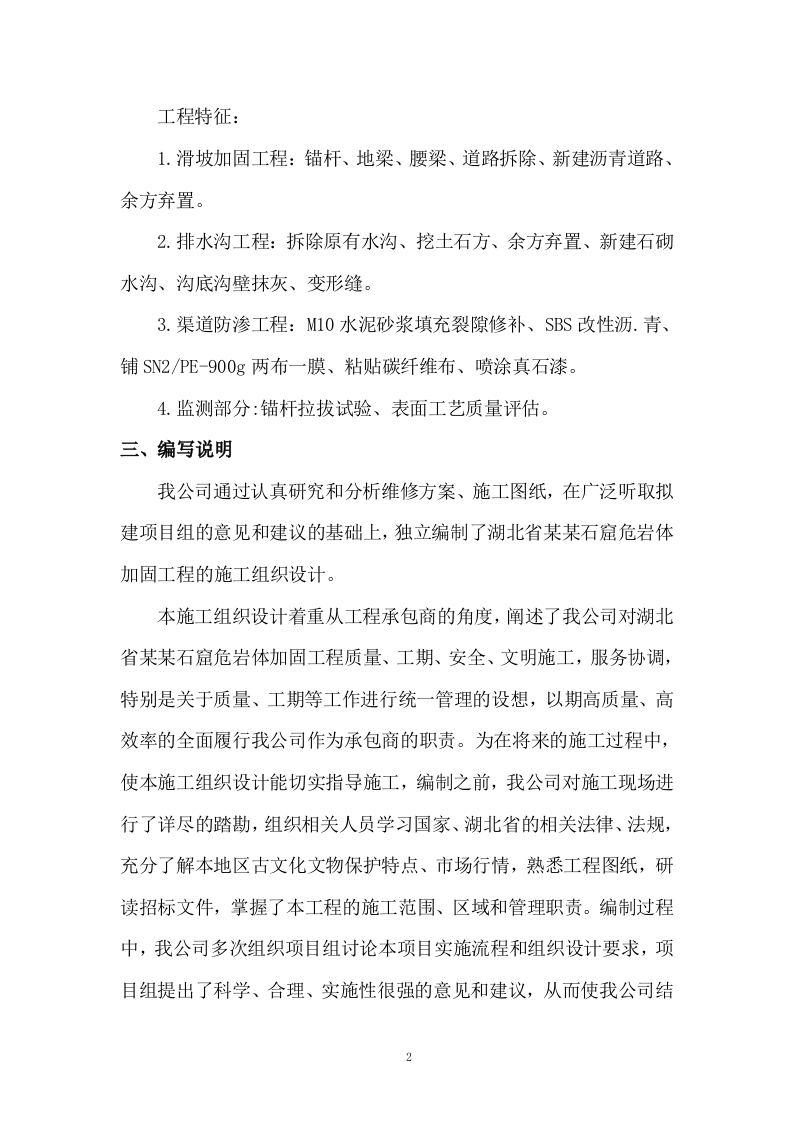 石窟危岩体加固工程目录第一章、工程概况…1第一节、工程主要情况.1第二节、各专业设计简介…6第三节、工程施工条件11第二章、施工部署12第一节、工程施工目标12第二节、主要施工内容及其进度安排15第三节、施工流水段划分17第四节、施工的重点和难点分析17第五节、工程管理的组织机构形式20第六节、项目经理部的工作岗位设置及其职责划分。22第七节、新技术、新工艺部署及其技术和管理要求24第三章、施工进度计划….34第四章、施工准备与资源配置计划….34第一节、施工准备包括技术准备34第二节、现场准备和资金准备37第三节、资源配置计划38第五章、主要施工方案.44第一节、施工组织构想44第二节、主要施工方案46第三节、脚手架工程.77第四节、临时用水用电工程96第五节、季节性施工等专项工程97第六节、其他工程说明…101第六章、施工现场平面布置…132