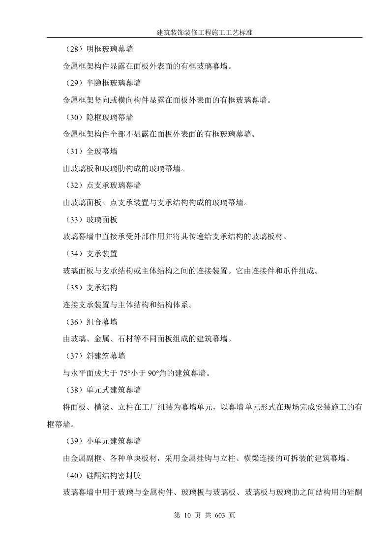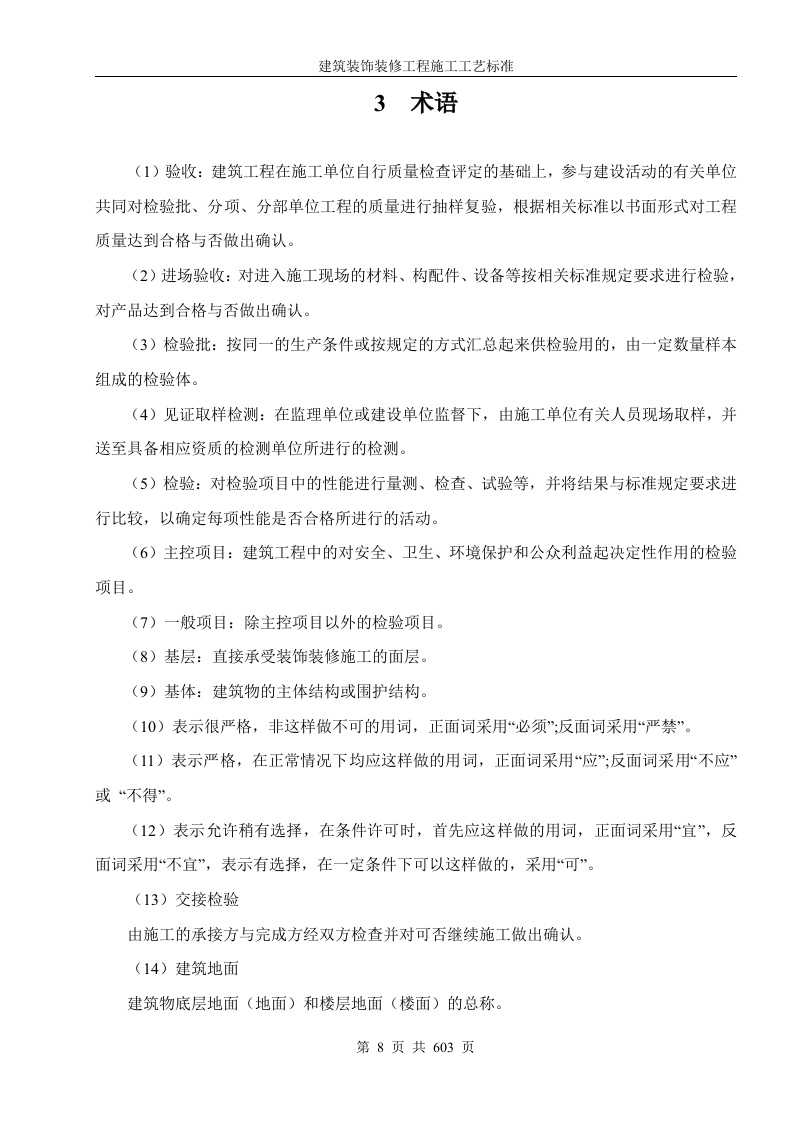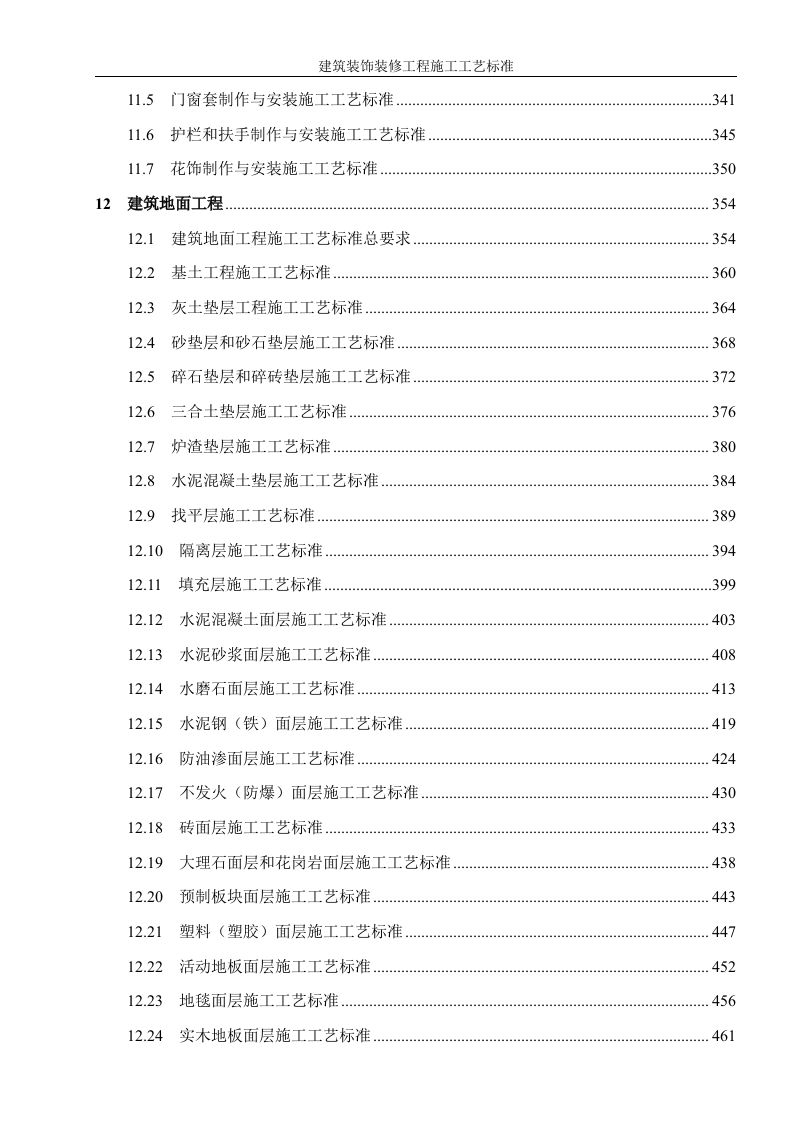 建筑装饰装修工程施工工艺标准目录1范围4420044444454444444440442规范性引用文件.23术语.44抹灰工程.84.1一般抹灰工程施工工艺标准..84.2室外水泥砂浆抹灰工程施工工艺标准.194.3水刷石抹灰工程施工工艺标准.304.4外墙斩假石抹灰工程施工工艺标准..414.5干粘石抹灰工程施工工艺标准…..514.6假面砖工程施工工艺标准.614.7清水砌体勾缝工程施工工艺标准.685吊顶工程.755.1轻钢骨架活动罩面板顶棚施工工艺标准.755.2轻钢骨架固定罩面板顶棚施工工艺标准.835.3轻钢骨架金属罩面板顶棚施工工艺标准。936轻质隔墙工程..1026.1木龙骨板材隔墙施工工艺标准。1026.2玻璃隔断墙施工工艺标准1096.3轻钢龙骨隔断墙施工工艺标准.1166.4金属、玻璃、复合板隔断墙施工工艺标准.1267饰面板(砖)工程1397.1室外贴面砖施工工艺标准.1397.2室内贴面砖施工工艺标准.1497.3墙面贴陶瓷锦砖施工工艺标准1577.4大理石、磨光花岗岩饰面施工工艺标准1657.5墙面干挂石材施工工艺标准..176