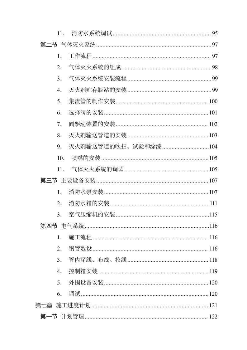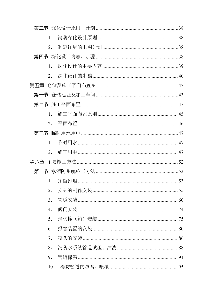 消防工程施工安装方案-施工组织设计目录第一章编制说明…第一节投标范围第二节实施目标2第三节编制依据3第二章工程概况及特点.7第一节工程概况.8第二节工程特点、重点及解决措施161.工程特点162.工程的重点及解决措施17第三章施工部署。444444444444444444444444444444419第一节施工组织机构.201.组织机构202.项目领导主要职责213.各部门主要职责.…234.项目主要领导成员.275.消防工程专家顾问团296.项目管理委员会…30第二节施工管理制度的建立.31第三节施工区域和阶段的划分.….32第四节施工流程34第四章深化设计…35第一节深化设计概况..36第二节深化设计流程44444436