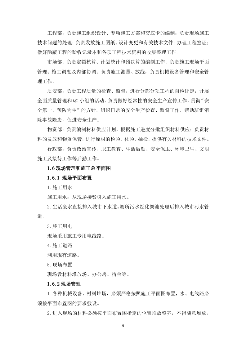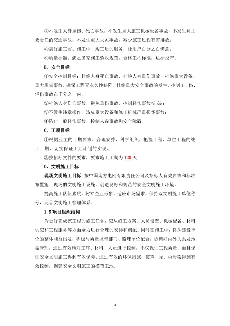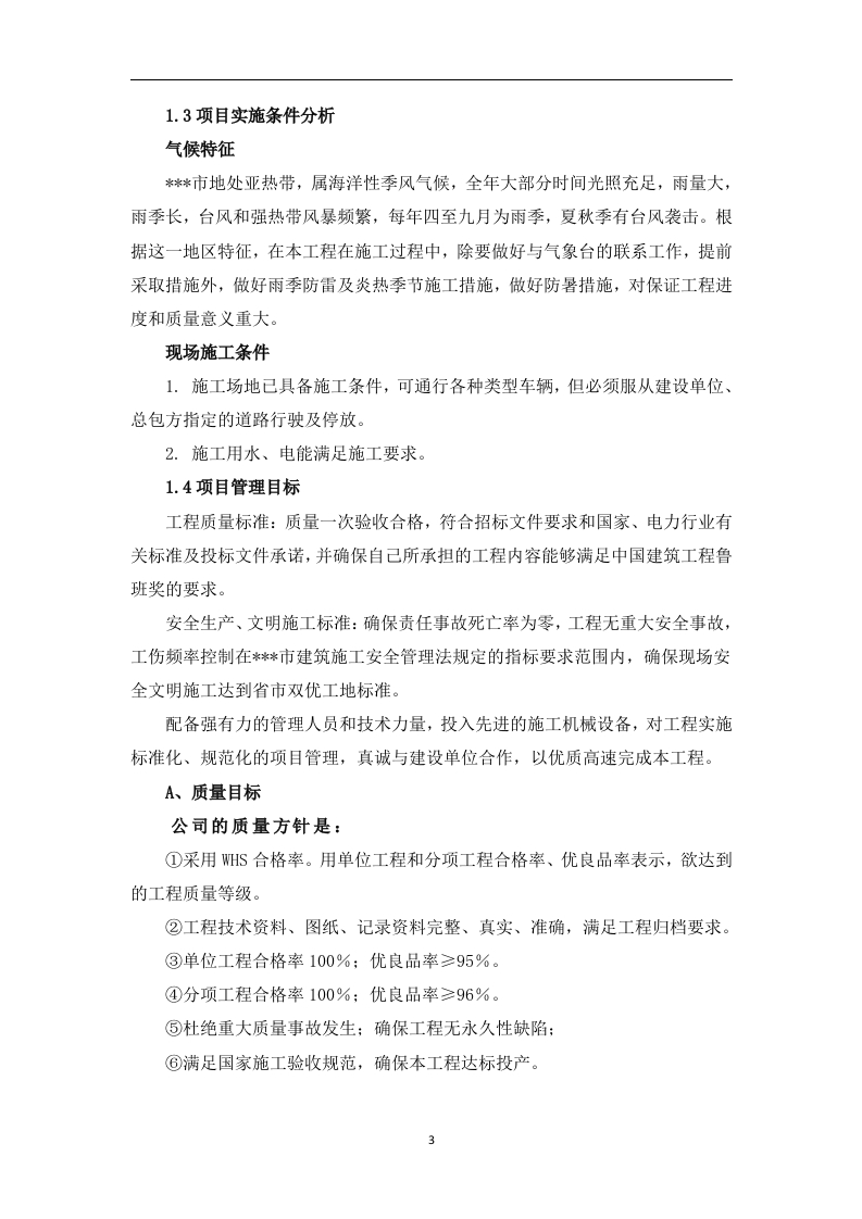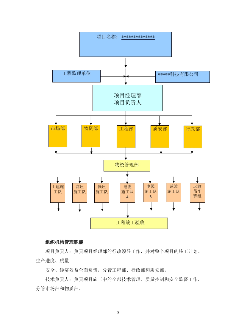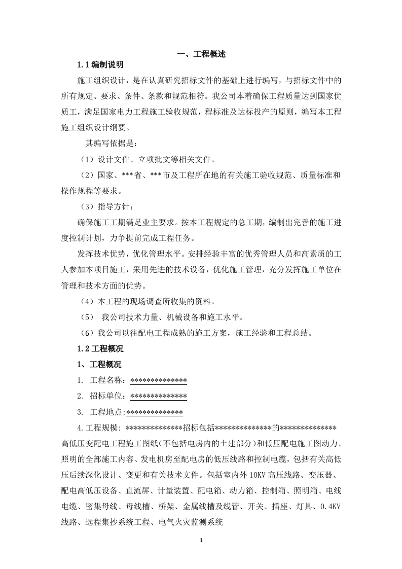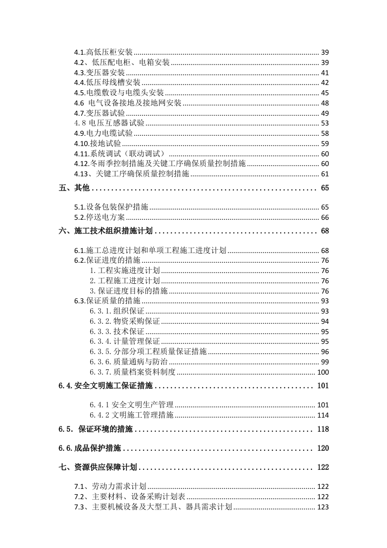 高低压变配电安装工程施工组织设计技术标目录一、工程概述.....1.1编荆说明.……….11.2工程概况.1.3项目实施条件分析….31.4项目管理目标31.5项目组织结构。.41.6现场管理和施工总平面图.61.7施工部署和施工准备工作。71.施工管理总体安排72.施工和管理人员的准备和拟投入的最高人数和平均人数93.施工现场准备和施工程序94.施工准备工作组织和时间安排。.11二、施工方案(含安装方案、验收方案)132.1.施工流向和施工顺序.132.2.施工阶段划分132.3.施工方法和施工机械选择132.3.1、高压开关柜安装….132.3.2、电力变压器安装.152.3.3、低压配电柜、电箱安装.162.3.4、电缆桥架安装.….182.3.5、电力电缆施工…192.3.6、系统保护调试...222.4.安全生产和文明施工设计232.5.安全技术组织措施….262.6.重要施工方案和特殊施工工序的安全过程控制272.7.文明施工的目标、组织机构和实施方案.…292.8.文明施工实施方案302.9.文明施工考核、管理办法.312.10.节能措施和办法.31三、环境管理.…343.1.环境保护及文明施工….343.2.环境保护.…343.3.加强施工管理、严格保护环境.353.4.本工程中影响环境的因素38四、施工方案(含重点、难点分析及对应方案)...39