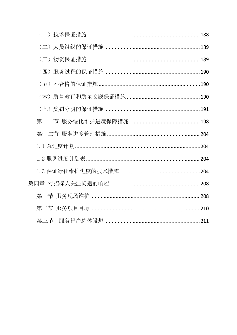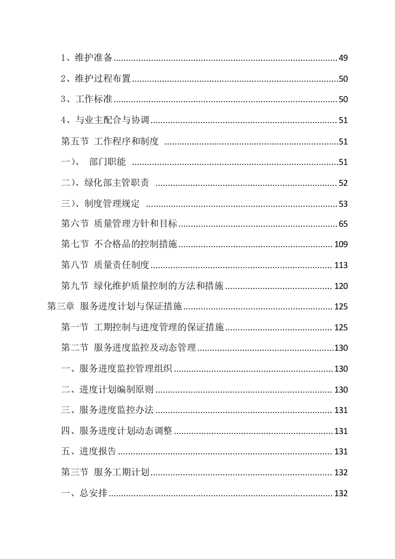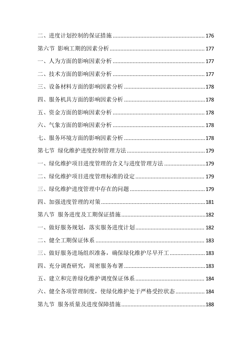 绿化工程施工方案目录第一章项目部署及服务方案3第一节办公设施及养护设备,.3第二节绿化维护管理制度.5第三节绿化维护工作人员安排计划..8第四节绿化维护技术方案…9第五节绿化保洁和保安工作方案23第六节养护维护组织方案.25第七节绿化维护管理工作的重难点.26第二章质量保证体系与控制措施…28第一节服务承诺及质量保证措施28第二节绿化维护绿化维护质量管理保证措施.37第三节绿化维护质量保证体系及措施41第四节绿化维护质量标准...424.1.1植物维护:444.1.2设施维护:454.1.3土肥、水标准:464.1.4病虫害防治标准:464.2具体维护标准:..46第四节服务安排、工作标准.49