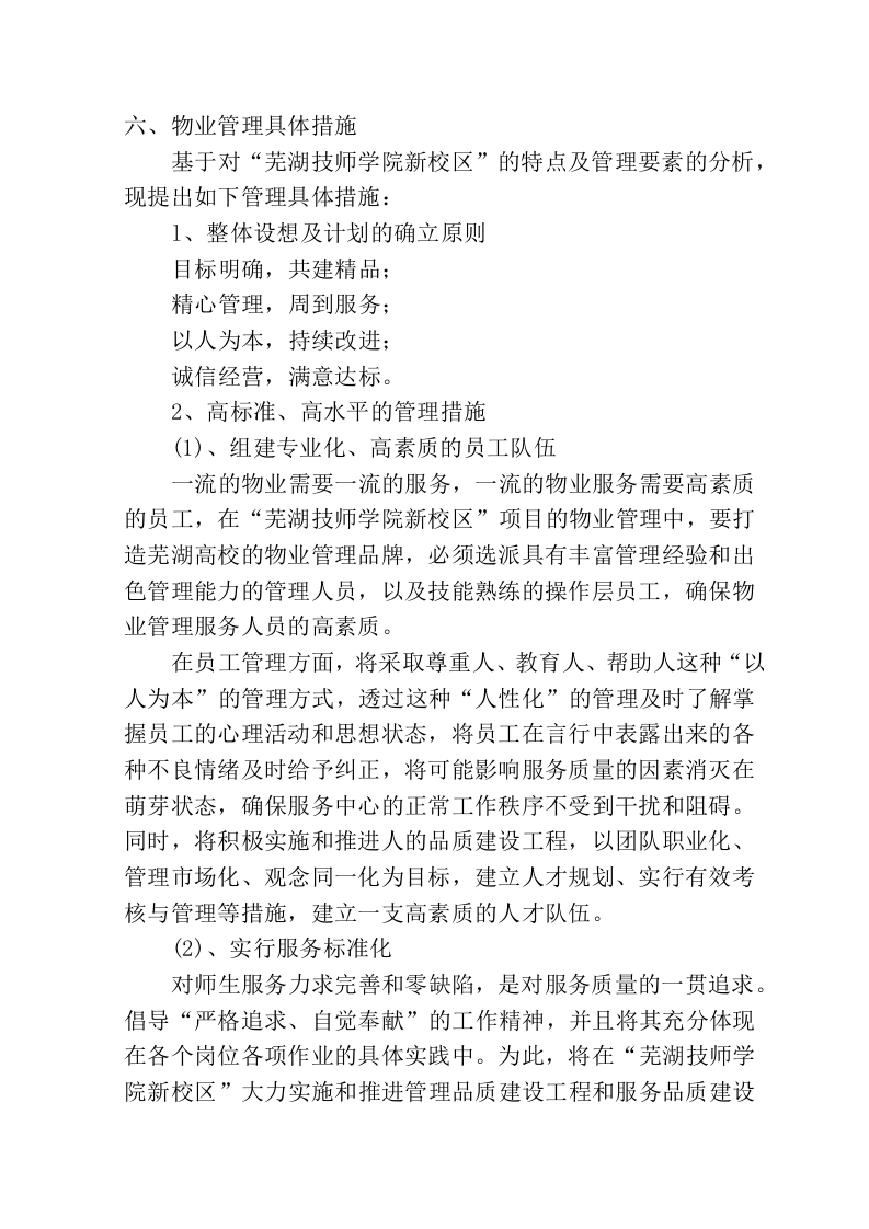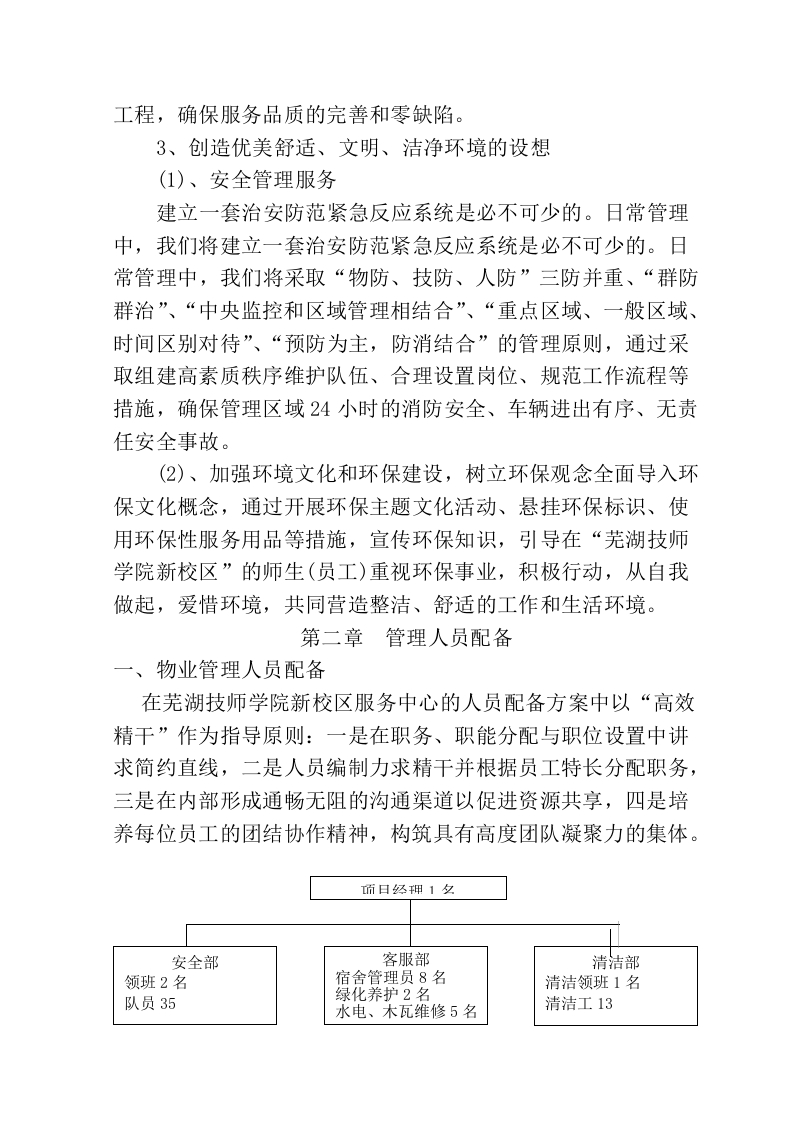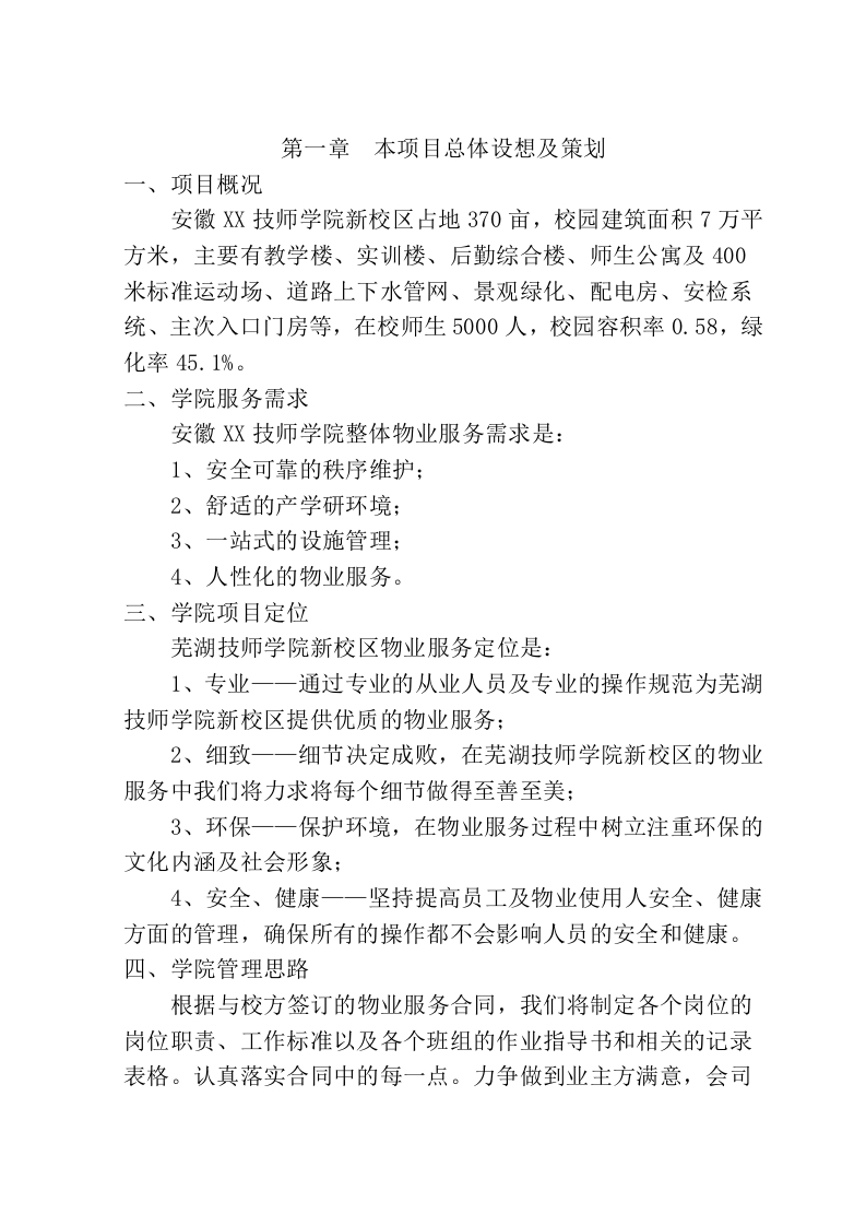 技师学院新校区物业管理方案目录第一章本项目总体设想及策划5一、项目概况.5二、学院月服务需求.5三、学院项目定位5四、学院管理思路….5五、学院整体管理方案策划6六、物业管理具体措施…7第二章管理人员配备….8一、物业管理人员配备…。.8二、本项目专业工种安排表.10第三章管理制度、方式及计划…一、学院各项管理制度建立…。二、人员管理15三、员工培训方案….17四、主要员工岗位职责..21五、员工仪容仪表、着装及标志.24六、各阶段工作计划.27七、学院管理档案的建立与管理.29第四章环境清洁卫生管理.…。.30一、管理思路….30二、作业规范….31三、学院清洁工作计划表及清洁标准..32四、服务工作程序….39五、检查与考核43第五章保安、消防及车辆管理….43一、管理思路.43二、学院各岗位作业规范44三、工作标准.45四、服务工作程序….46五、停车场管理方案…47第六章绿化管理….51一、管理思路51二、绿化项目管理目标.。.52三、绿化消杀服务管理….53四、应急方案….56五、检查与考核…。.56第七章学院设施设备管理.57一、公共设备管理…。.57二、房屋本体和公共设施维修养护管理.63三、公共能耗管理….64