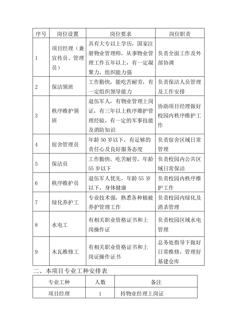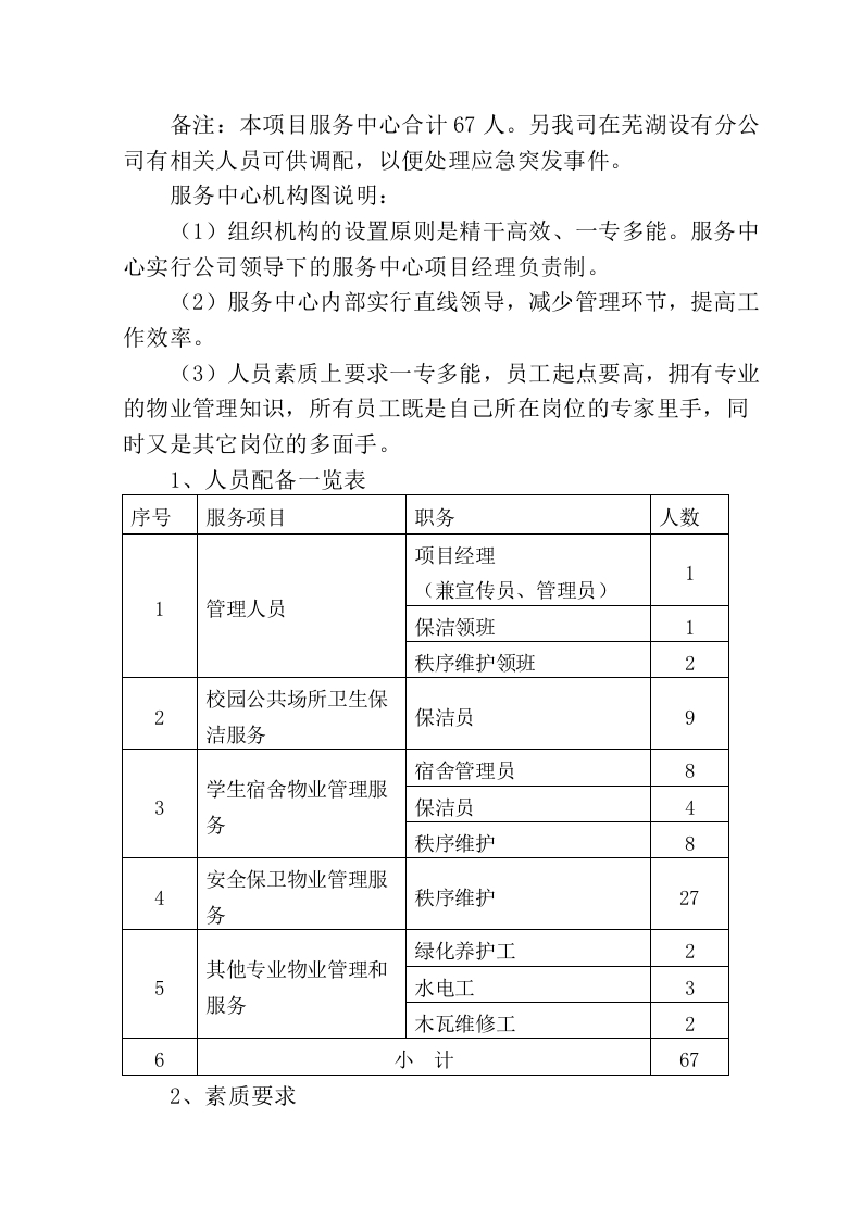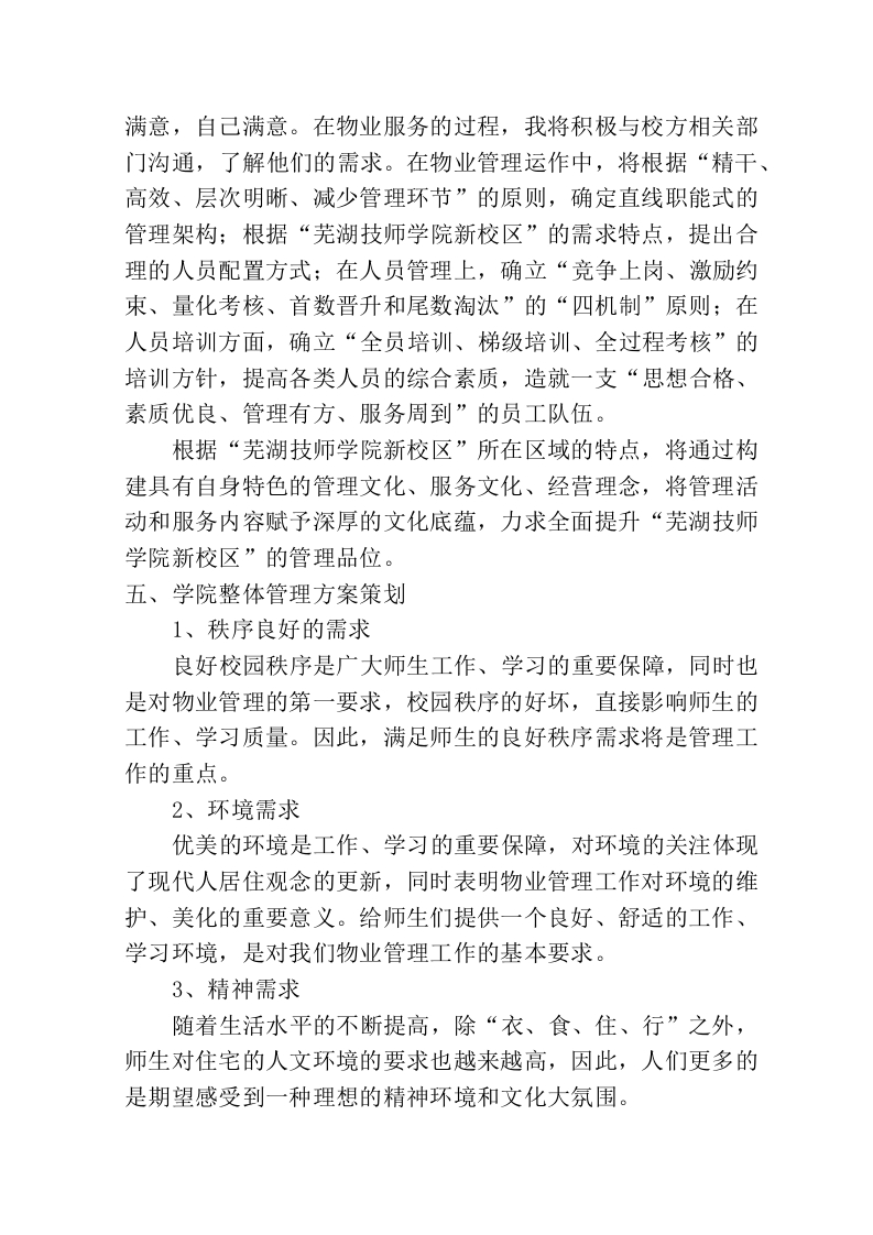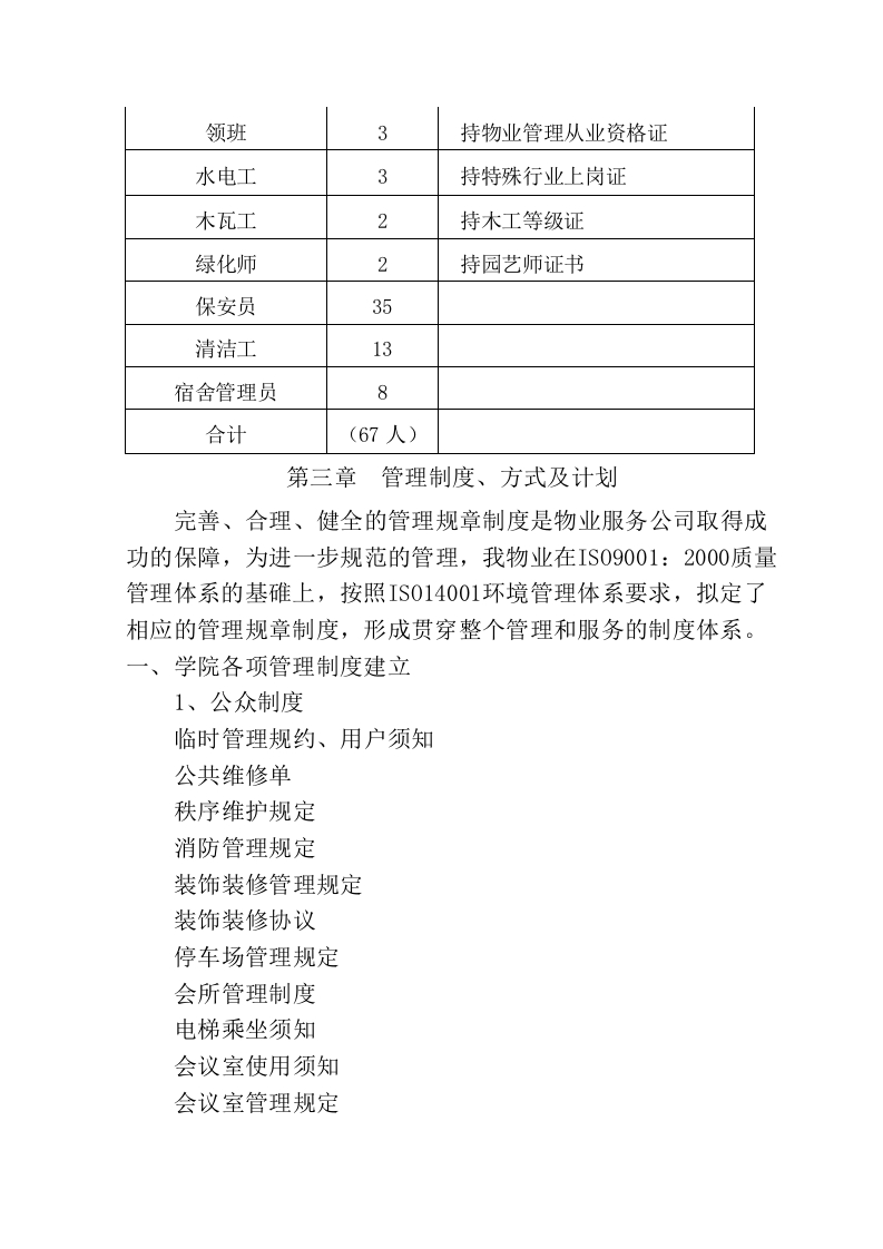 技师学院新校区物业管理方案目录第一章本项目总体设想及策划5一、项目概况.5二、学院月服务需求.5三、学院项目定位5四、学院管理思路….5五、学院整体管理方案策划6六、物业管理具体措施…7第二章管理人员配备….8一、物业管理人员配备…。.8二、本项目专业工种安排表.10第三章管理制度、方式及计划…一、学院各项管理制度建立…。二、人员管理15三、员工培训方案….17四、主要员工岗位职责..21五、员工仪容仪表、着装及标志.24六、各阶段工作计划.27七、学院管理档案的建立与管理.29第四章环境清洁卫生管理.…。.30一、管理思路….30二、作业规范….31三、学院清洁工作计划表及清洁标准..32四、服务工作程序….39五、检查与考核43第五章保安、消防及车辆管理….43一、管理思路.43二、学院各岗位作业规范44三、工作标准.45四、服务工作程序….46五、停车场管理方案…47第六章绿化管理….51一、管理思路51二、绿化项目管理目标.。.52三、绿化消杀服务管理….53四、应急方案….56五、检查与考核…。.56第七章学院设施设备管理.57一、公共设备管理…。.57二、房屋本体和公共设施维修养护管理.63三、公共能耗管理….64