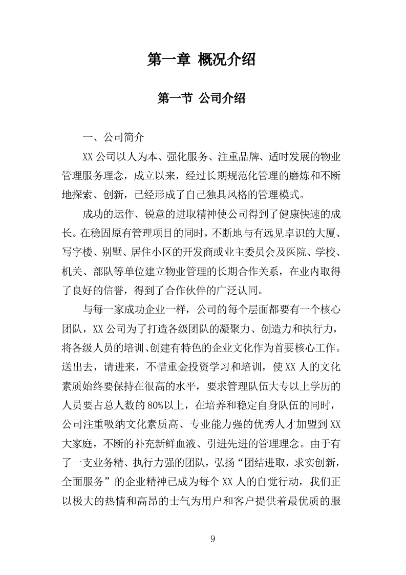医院物业投标方案目录第一章概况介绍········第一节公司介绍······9一、公司简介9二、物业管理经验·····。·10三、物业管理优势·······13第二节背景介绍········14一、项目分析·······14二、整体思路····。····15三、体制与机制····第二章项目总体部署·····18第一节管理方式及管理服务措施·········18一、业务流程·······二、运作机制········。····18三、管理服务措施··············18四、内部运作通道··············23五、服务反场··。。。·。。。。。。。。··24第二节前期物业管理思路及模式·········24一、管理思路················24二、管理方式················25三、创建服务价值链·············25第三节服务内容与标准管理目标·········26一、管理服务内容··············261