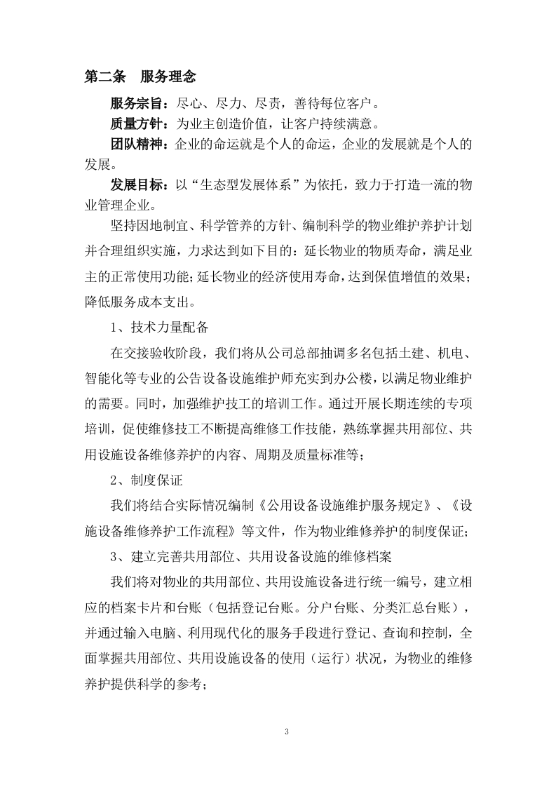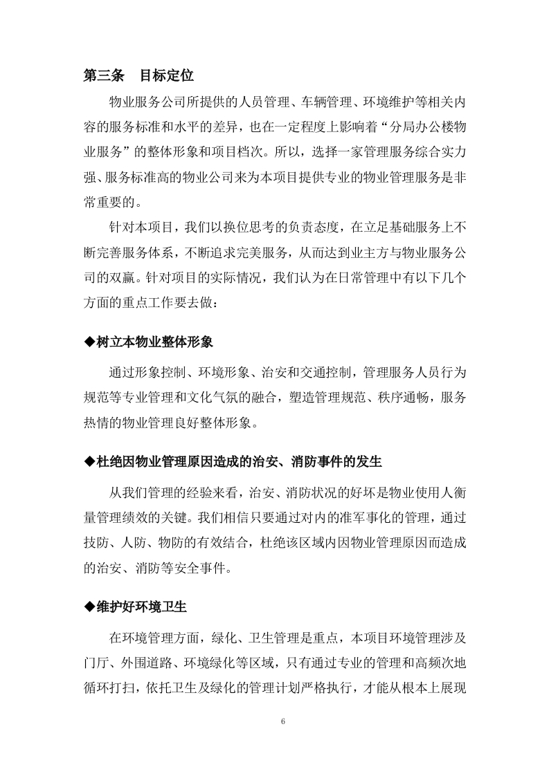 市公安局xx区分局办公楼物业管理服务项目总体管理方案目录第一节总体管理方案...第一条项目概况..·第二条服务理念.·3第三条目标定位.·7第四条理解程度...·.19第五条管理目标明确、起点高、要求严21第六条服务理念具有创新性、针对性、超前性.···23第七条具有较强的统筹协调能力、执行力.....28第二节项目实施方案.31第一条服务机构、工作职能组织运行图31第二条保洁服务方案...。31第三条安全管理服务方案...82第二条会议服务方案....143第三条设备设施维护保养方案.....192第四条绿化养护方案....239第五条节能降耗方案...284第六条易耗品管理方案..·…···....309第七条零星维修方案..··322第三节人员专业素质及员工招聘标准..··.339第一条人员业务素质及政治面貌.…339第二条人员工作能力.·340