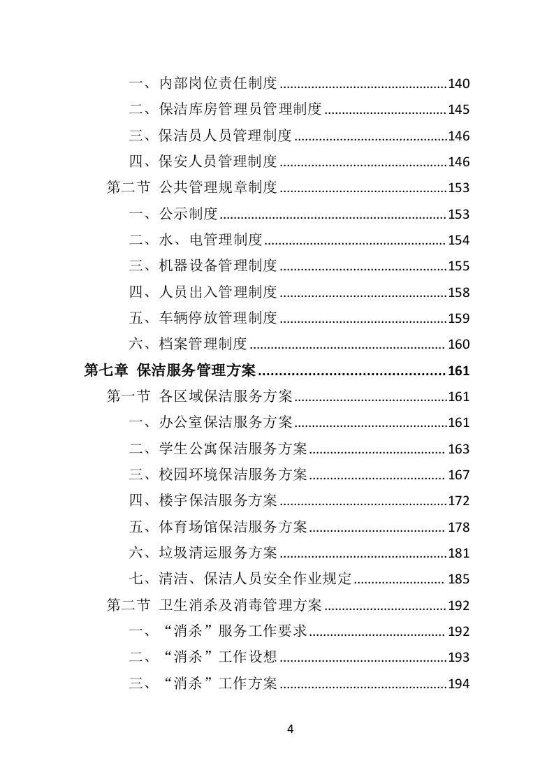 学校物业服务投标方案目录第一章物业服务整体设想与策划….16第一节学校物业管理的特点….16一、学校物业管理的特点.17二、学校物业管理的着力点….19第二节学校物业管理合理化建议….23一、加强管理手段建设.23二、加强队伍素质建设.23三、接受国家教育主管部门的指导.24第三节项目管理的整体设想及规划….25一、物业管理思路.…..25二、物业管理目标….…26三、管理模式….30四、管理服务方法及标准….31五、物业管理内容.36六、工作重难点分析...51第二章物业服务创新设想…..55第一节物业服务模式的定位..56一、辅助于教育事业的辅理功能定位.56二、着眼于学校发展的管理创新定位..56三、致力于品牌建设的服务层次定位57第二节学校物业管理创新的目标..57三、对各方关系进行妥善协调…581